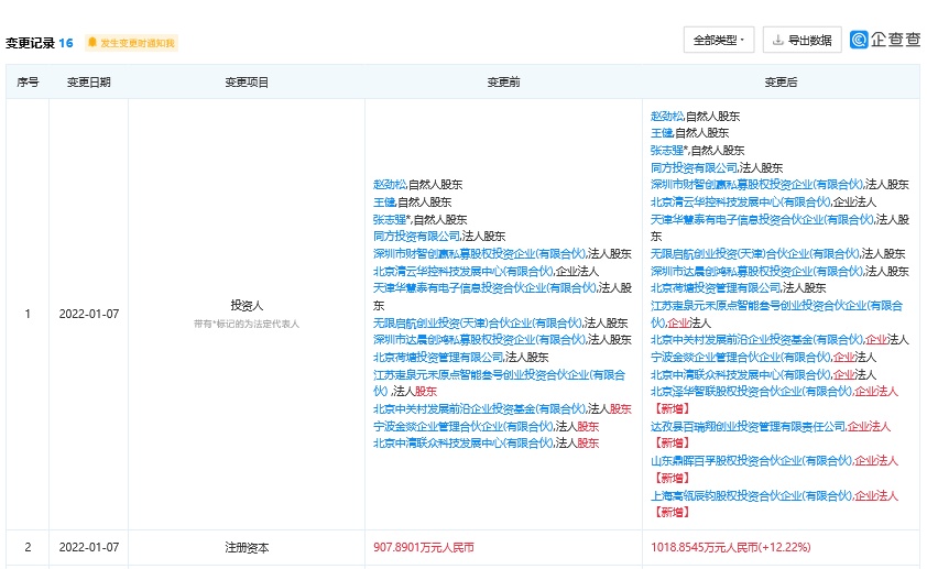 智通财经APP获悉,企查查APP显示,清云智通(北京)科技有限公司发生工商变更,新增百度关联公司达孜县百瑞翔创业投资管理有限责任公司为股东,同时公司注册资本由907.89万元人民币增加至1018.85万元人民币,增幅为12.22%。