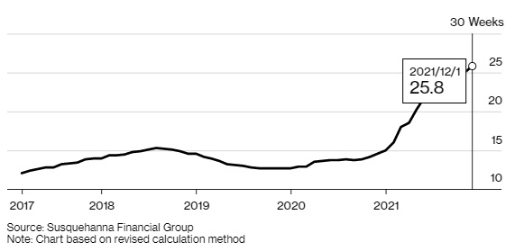 在芯片交付方面,海纳国际(Susquehanna)研究显示,半导体芯片交付时间在去年12月进一步提升至25.8周,这也是该机构2017年开始追踪该数据以来的最高值。处于高位的交付周期意味着苹果、福特等大厂继续因为拿不到足够芯片,只能干看着数十亿美元的需求但无力兑现。