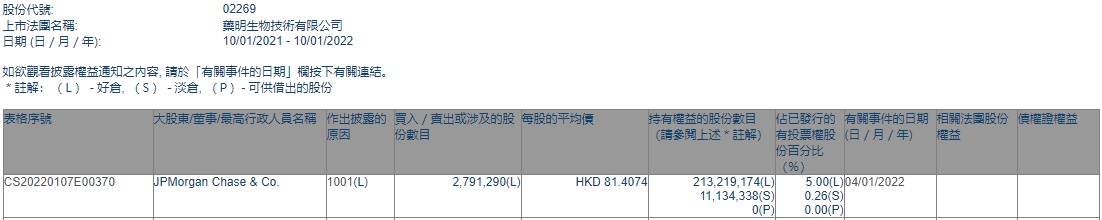 智通财经APP获悉,香港联交所最新资料显示,1月4日,小摩增持药明生物(02269)279.1290万股,每股作价81.4074港元,总金额约为2.27亿港元。增持后最新持股数目约为2.13亿股,最新持股比例为5.00%。