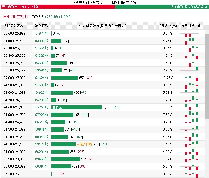 法兴恒指牛熊证街货分布图中的数据显示,熊证街货重货区在24600-24699区间,该区间最新熊证数量为1054张,较上一交易日增加119张;最多新增在24100-24199区间,该区间最新熊证数量为513张,较上一交易日增加214张。
