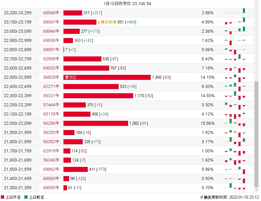 牛证街货重货区在22500-22599区间,该区间最新牛证数量为1458张,较上一交易日减少63张;最多新增在23100-23199区间,该区间最新牛证数量为551张,较上一交易日增加484张。
