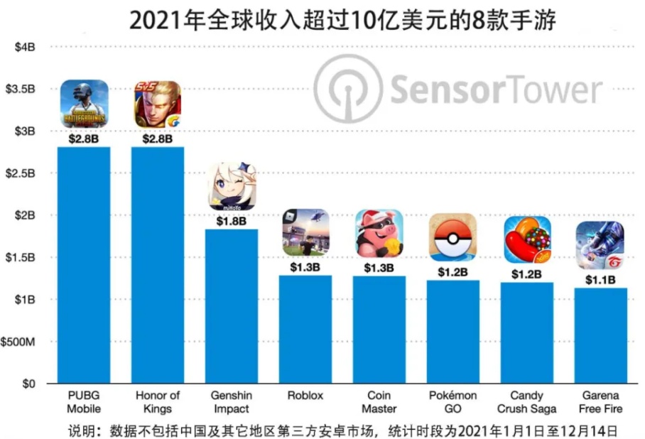 mobile》、《王者荣耀》和米哈游《原神》为首的8款手游,2021年在全球App Store和Google Play均获得超过10亿美元的内购收入。