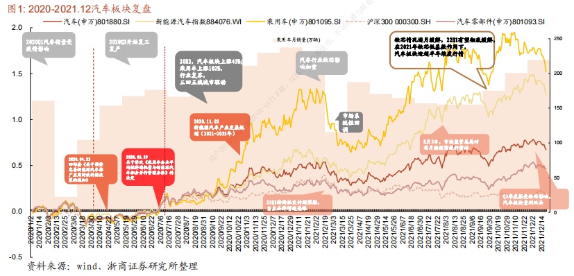 就A股市场来看,2021年Q1受汽车芯片供应不足影响,行业供给端受到较大影响,叠加市场风险偏好下行,汽车板块遭遇大幅回调;Q2随着芯片供给环比改善,板块行情重新启动;进入Q3,马来西亚疫情爆发导致芯片厂停产,同时上游原材料价格大幅上涨对车企成本造成扰动,部分投资者基于对三季报的悲观预期,开始主动回避汽车板块;但随着马来西亚芯片供应商的复工复产,Q4芯片供给环比改善,汽车板块仍整体保持震荡上升趋势。