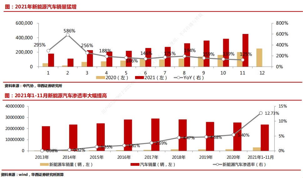 以产业视角来看,当前正处于汽车向电动化、智能化转型的历史性时刻。一方面,2021年我国新能源汽车渗透率加速提升。数据显示,2021年1-11月,我国新能源汽车渗透率达到12.73%,再度刷新历史新高;单月销量看,1-9月新能源汽车销量单月同比增幅均在100%以上。