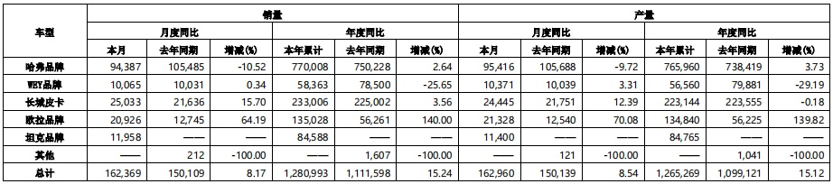 分品牌看,2021年哈弗品牌全年销量77万辆,同比增长2.64%;欧拉品牌全年销量13.5万辆,同比劲增140%;魏牌全年销量58363辆,累计用户突破45万;坦克300全年销售84588辆,目前坦克品牌在我国越野车市场份额超过50%;皮卡销量23.3万辆,同比增长3.56%。
