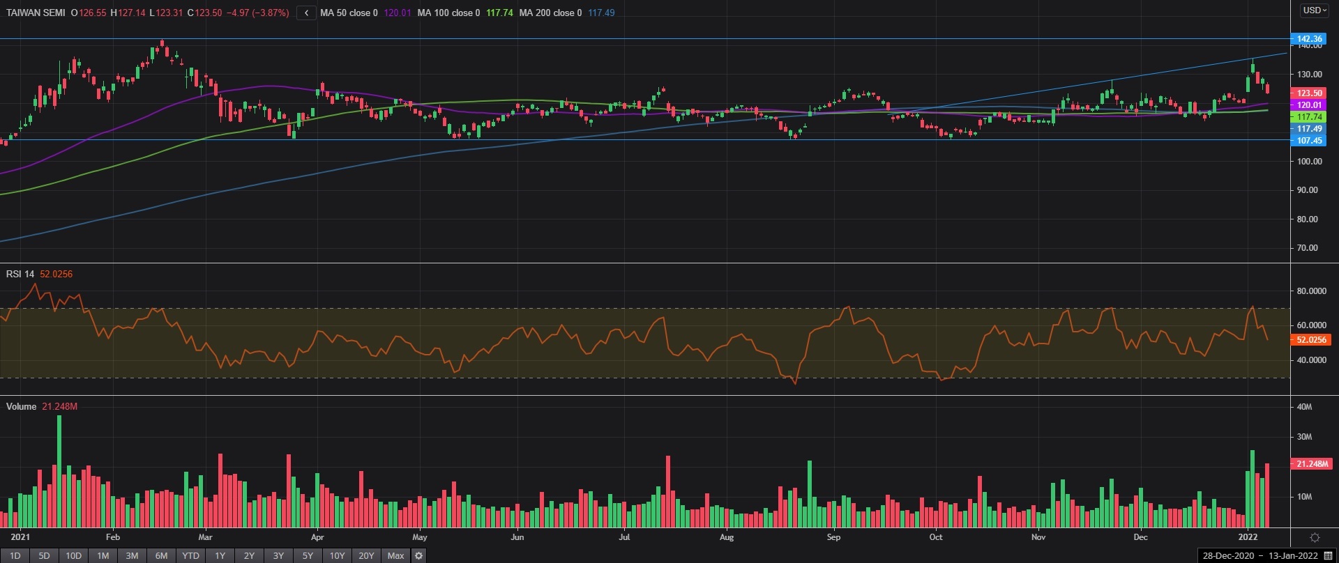 对于台积电美股来说,该股在2022年首个交易日便大幅上涨,在1月4日创下11个月以来的股价新高。该股股价可能会回落至121美元关口、与移动平均线保持一致,然后再决定下一步走势。50日移动均线最近同时突破了100日和200日移动均线,显示出强烈的看涨信号,这也收到RSI指标仍处于看涨区域以及自2022年初以来成交量显著增加的支撑。