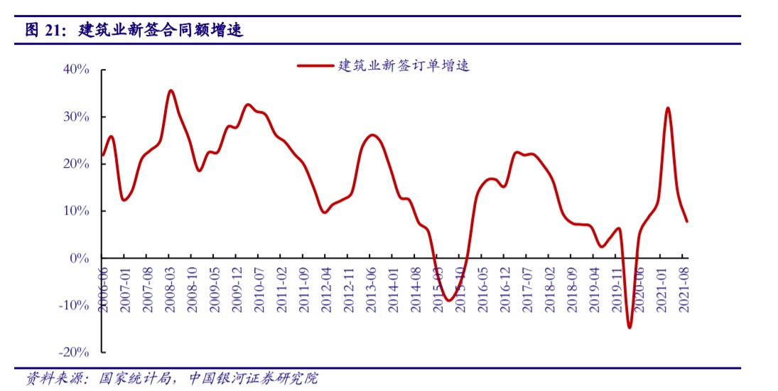 由于2020年行业发展“前低后高”,因此2021年的建筑行业呈现出增速一路下滑的特殊走势,这也在行业新签合同增速上有明显体现。据国家统计局数据显示,2021年上半年时,全国建筑行业新签订合同价值同比增长14.4%,但至2021年前三季度时,新签订单增速回落至7.8%,增速同比降低0.96个百分点,环比降低6.6个百分点,回落趋势明显。
