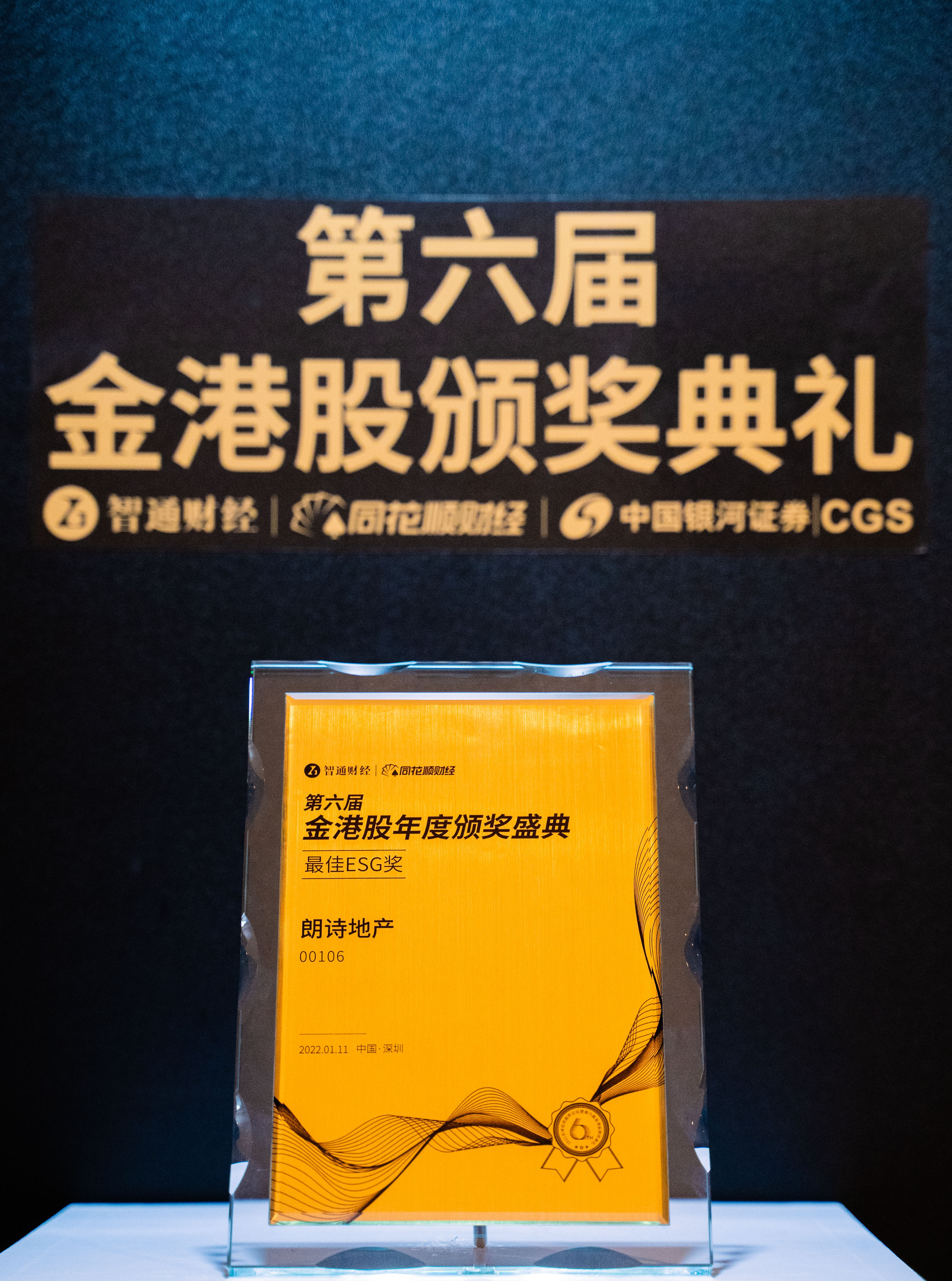 2022年1月11日,在深圳举办的“2022年全球投资趋势论坛暨第六届金港股颁奖典礼”上,朗诗地产(00106)荣获“最佳ESG奖”奖项。