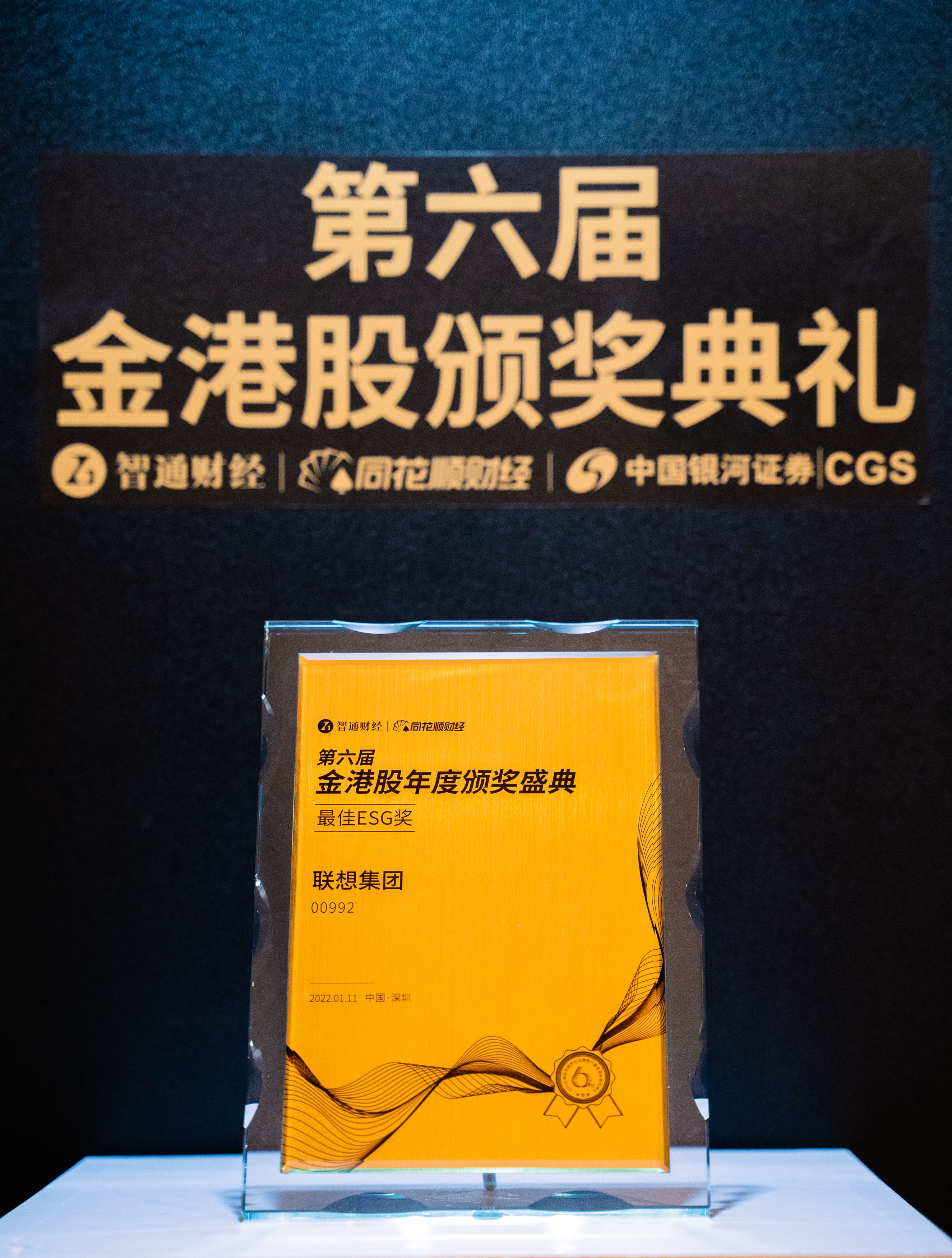 2022年1月11日,在深圳举办的“2022年全球投资趋势论坛暨第六届金港股颁奖典礼”上,联想集团(00992)荣获“最佳ESG奖”奖项。
