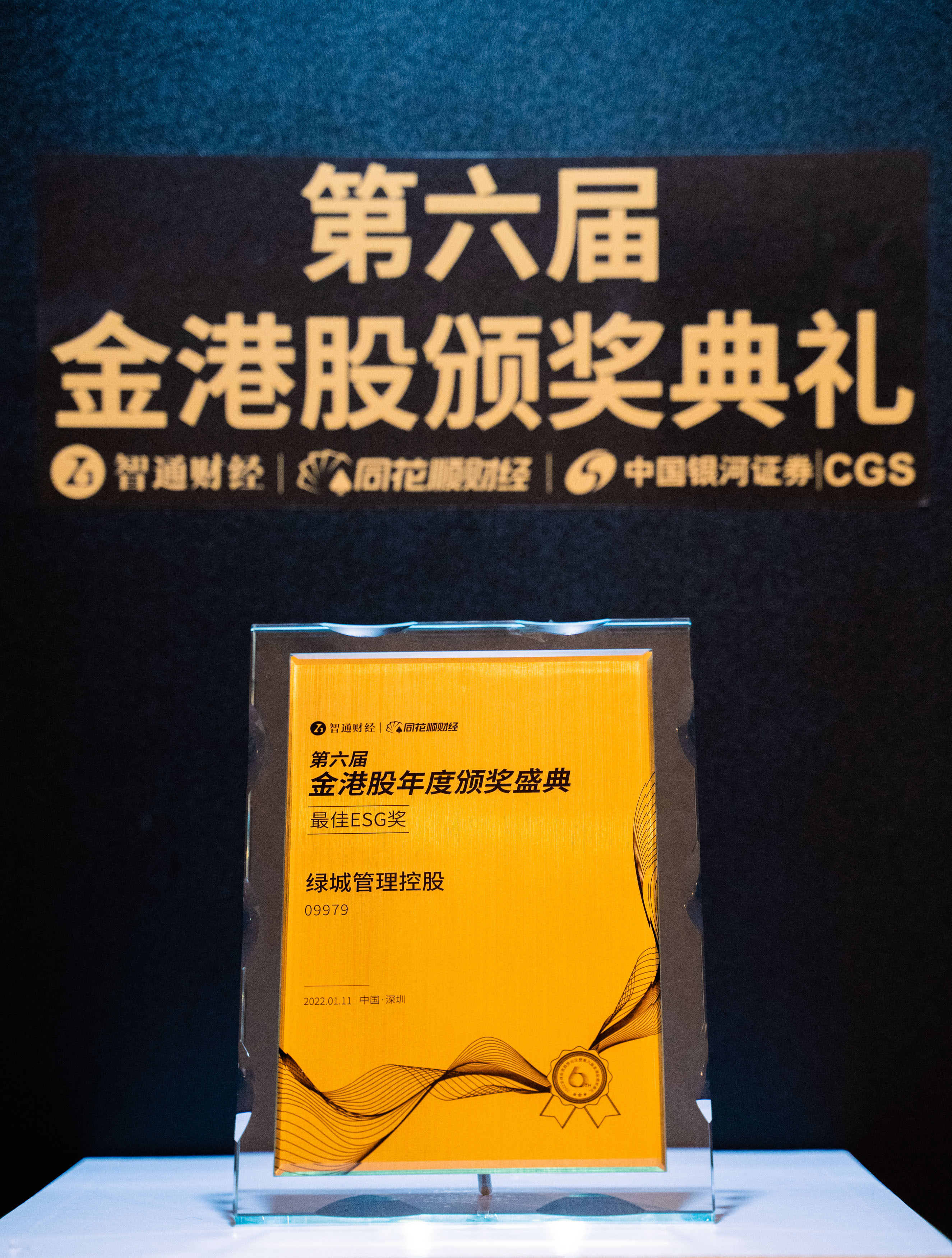 2022年1月11日,在深圳举办的“2022年全球投资趋势论坛暨第六届金港股颁奖典礼”上,绿城管理控股(09979)荣获“最佳ESG奖”奖项。