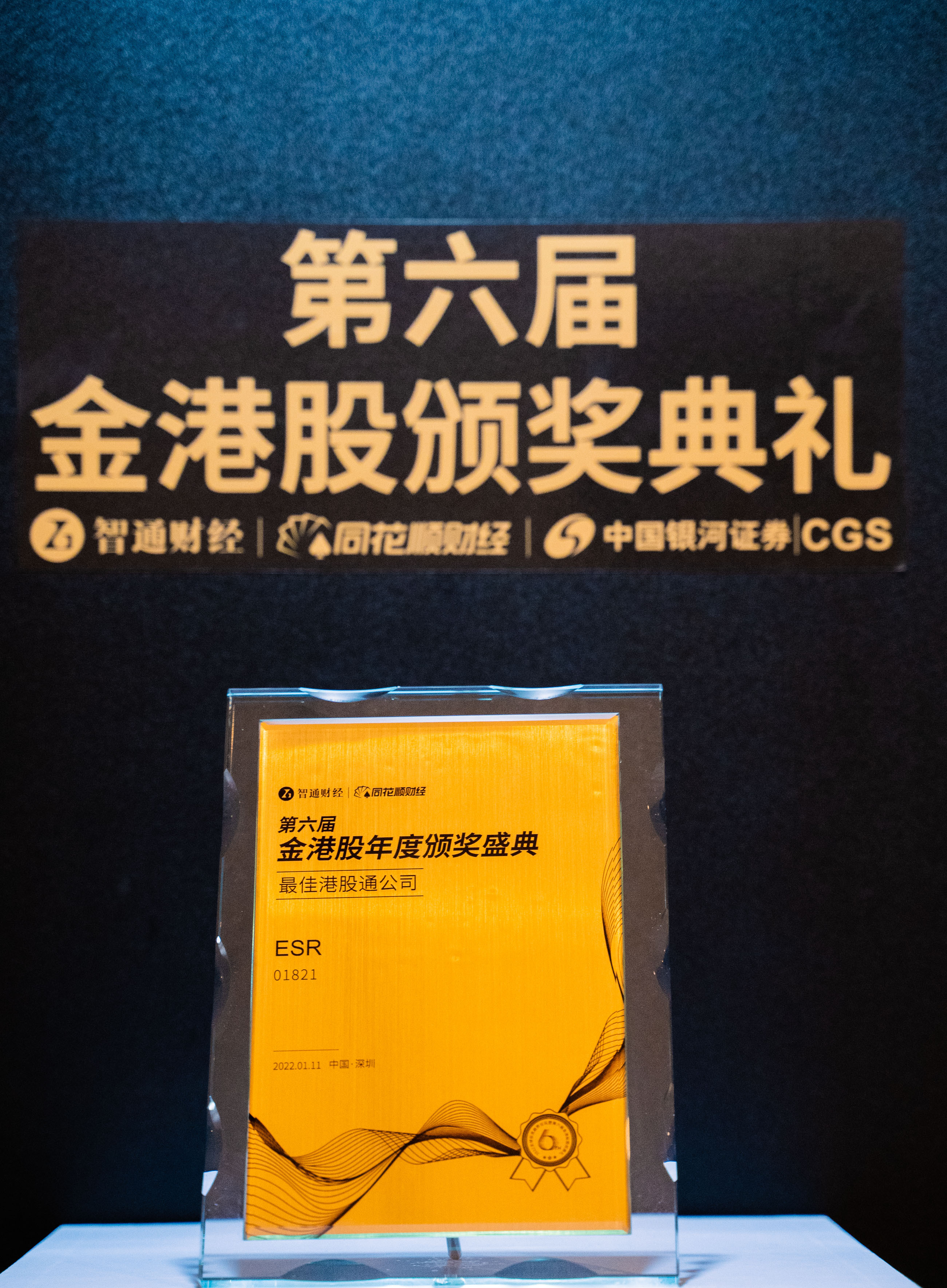 2022年1月11日,在深圳举办的“2022年全球投资趋势论坛暨第六届金港股颁奖典礼”上,ESR(01821)荣获“最佳港股通公司”大奖。