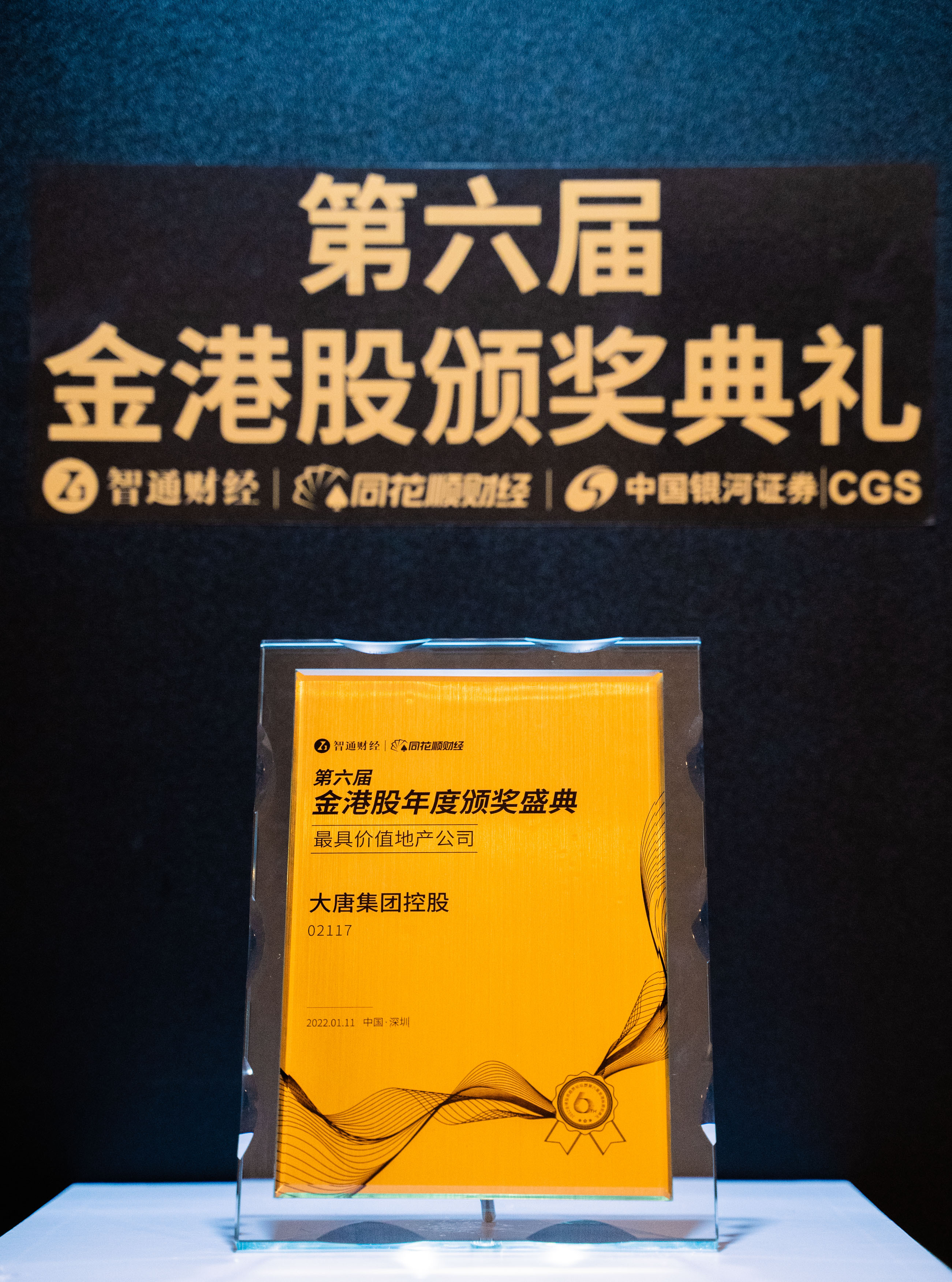 2022年1月11日,在深圳举办的“2022年全球投资趋势论坛暨第六届金港股颁奖典礼”上,大唐集团控股(02117)荣获“最具价值地产公司”奖项。