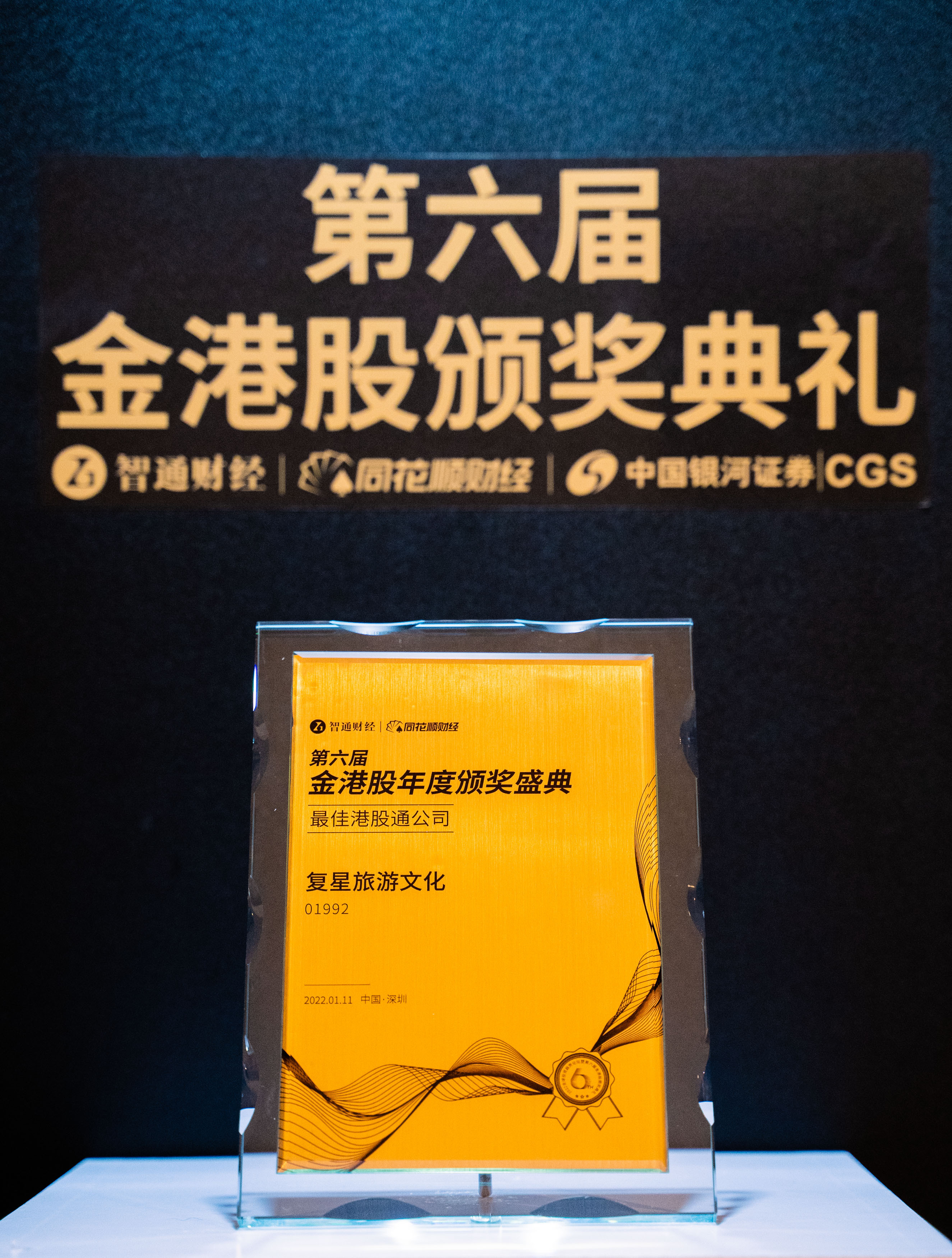 2022年1月11日,在深圳举办的“2022年全球投资趋势论坛暨第六届金港股颁奖典礼”上,复星旅游文化(01992)荣获“最佳港股通公司”大奖。