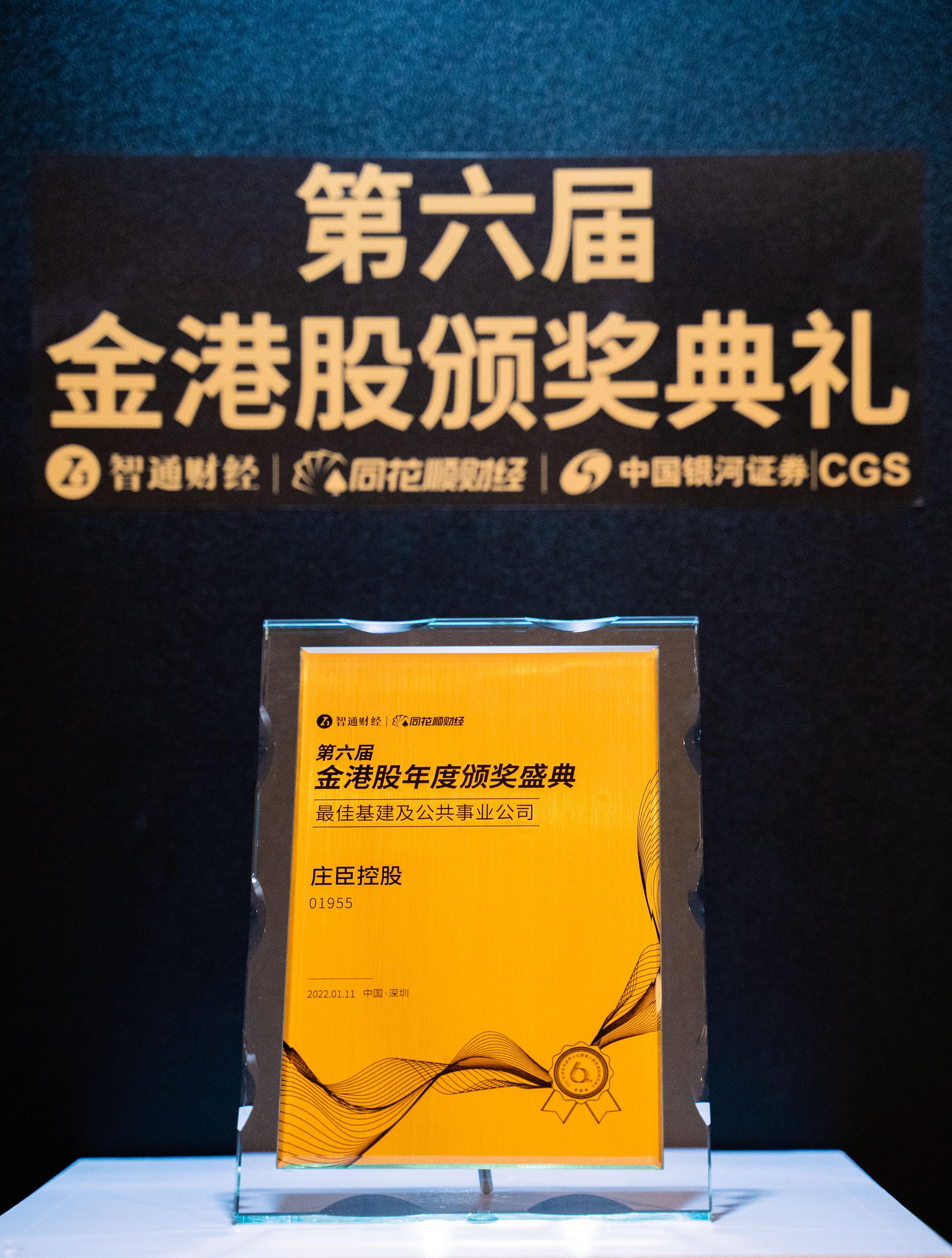2022年1月11日,在深圳举办的“2022年全球投资趋势论坛暨第六届金港股颁奖典礼”上,庄臣控股(01955)荣获“最佳基建及公共事业公司”奖项。