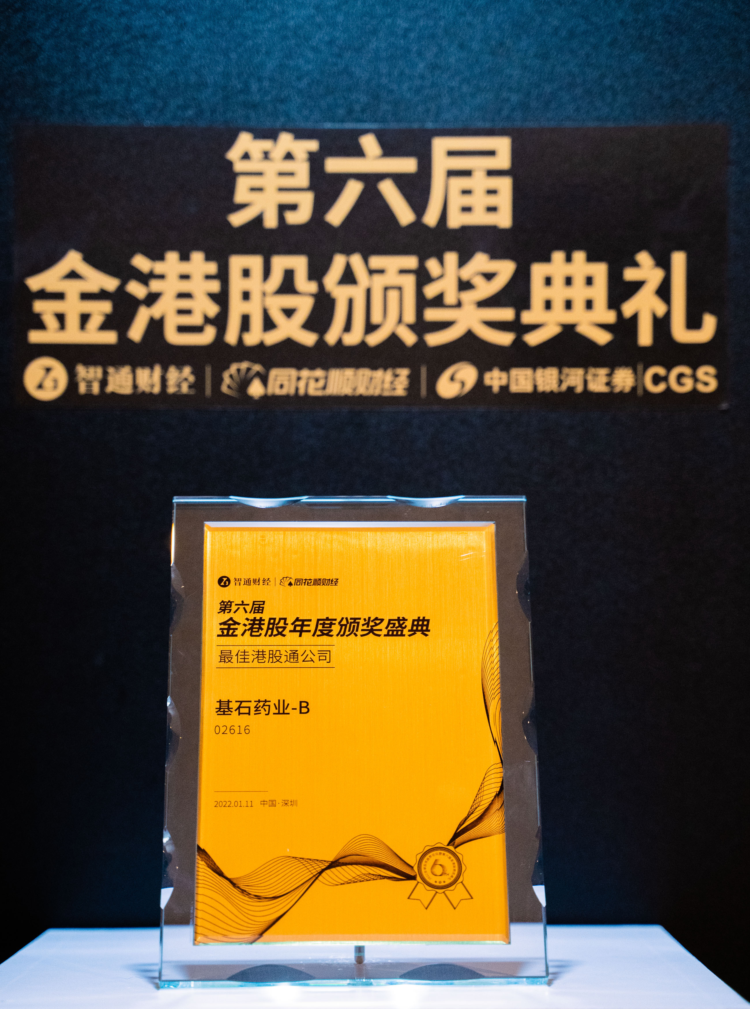 2022年1月11日,在深圳举办的“2022年全球投资趋势论坛暨第六届金港股颁奖典礼”上,基石药业-B(02616)荣获“最佳港股通公司”大奖。