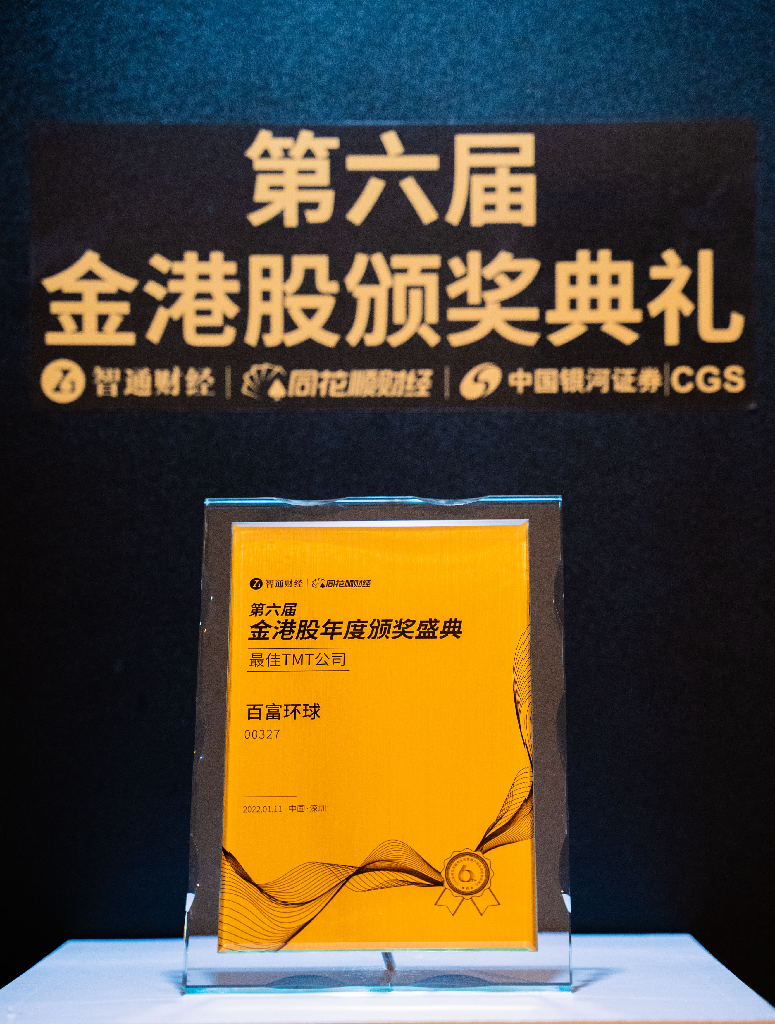 2022年1月11日,在深圳举办的“2022年全球投资趋势论坛暨第六届金港股颁奖典礼”上,百富环球(00327)荣获“最佳TMT公司”奖项。