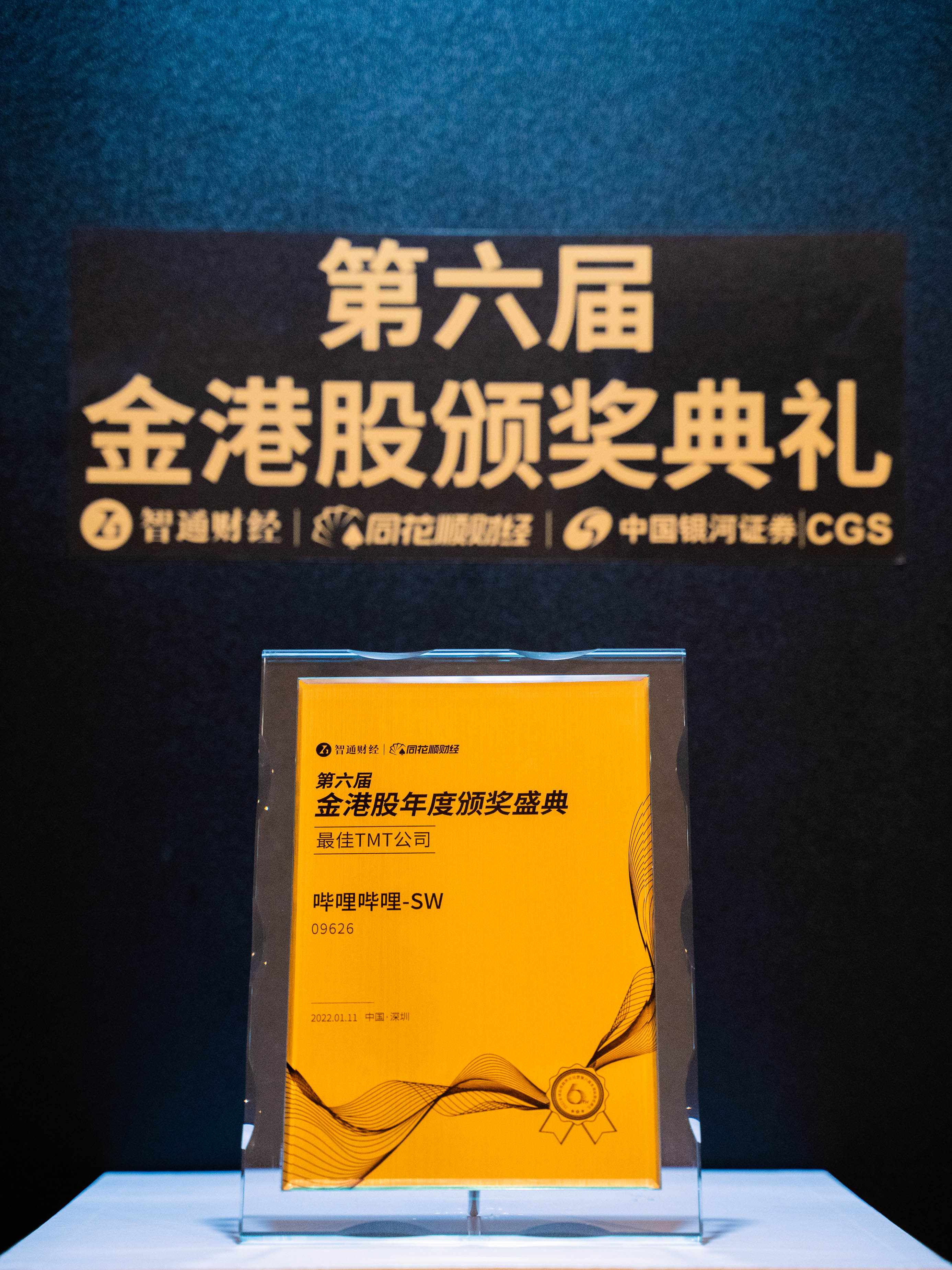 2022年1月11日,在深圳举办的“2022年全球投资趋势论坛暨第六届金港股颁奖典礼”上,哔哩哔哩-SW(09626)荣获“最佳TMT公司”奖项。