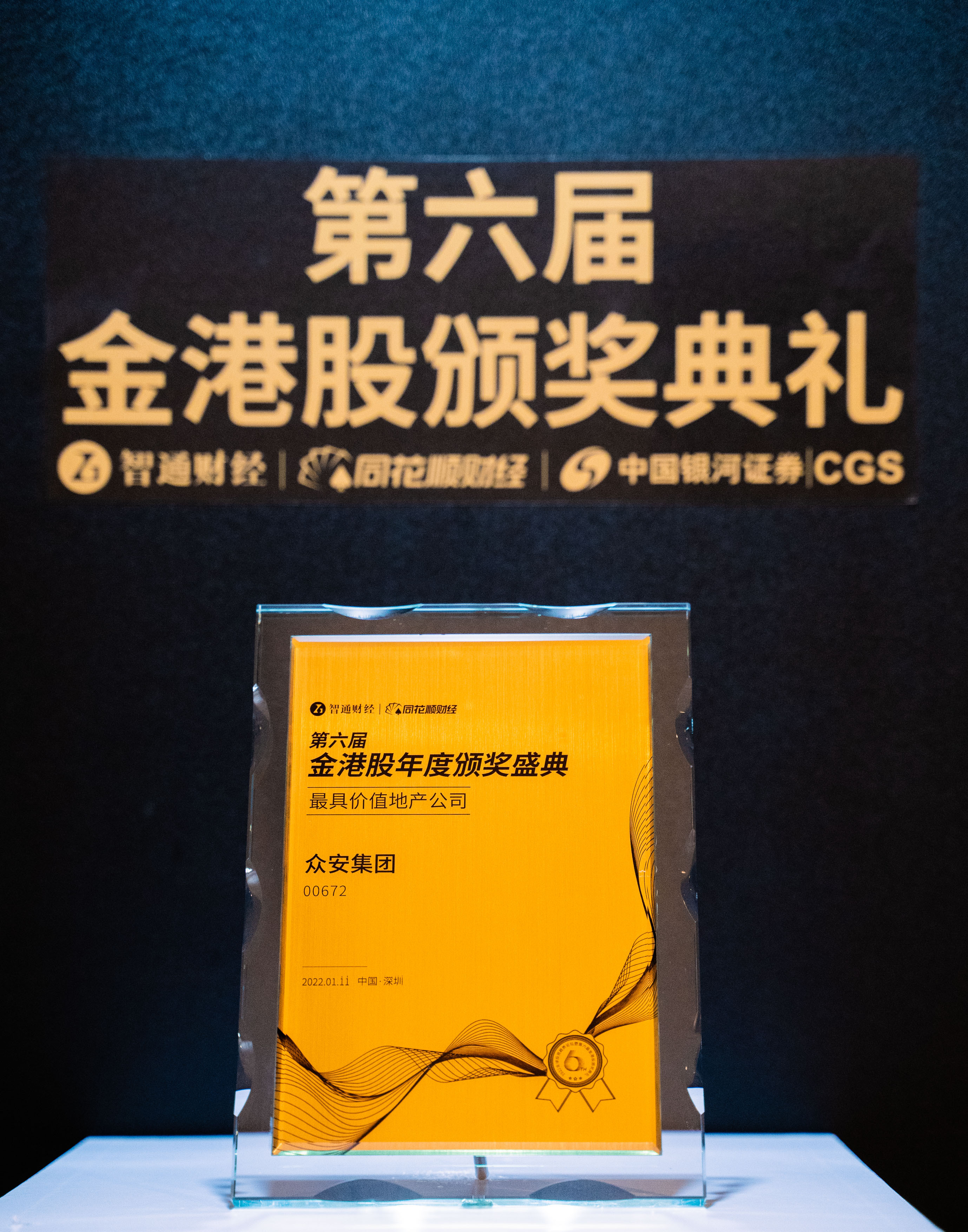 2022年1月11日,在深圳举办的“2022年全球投资趋势论坛暨第六届金港股颁奖典礼”上,众安集团(00672)荣获“最具价值地产公司”奖项。