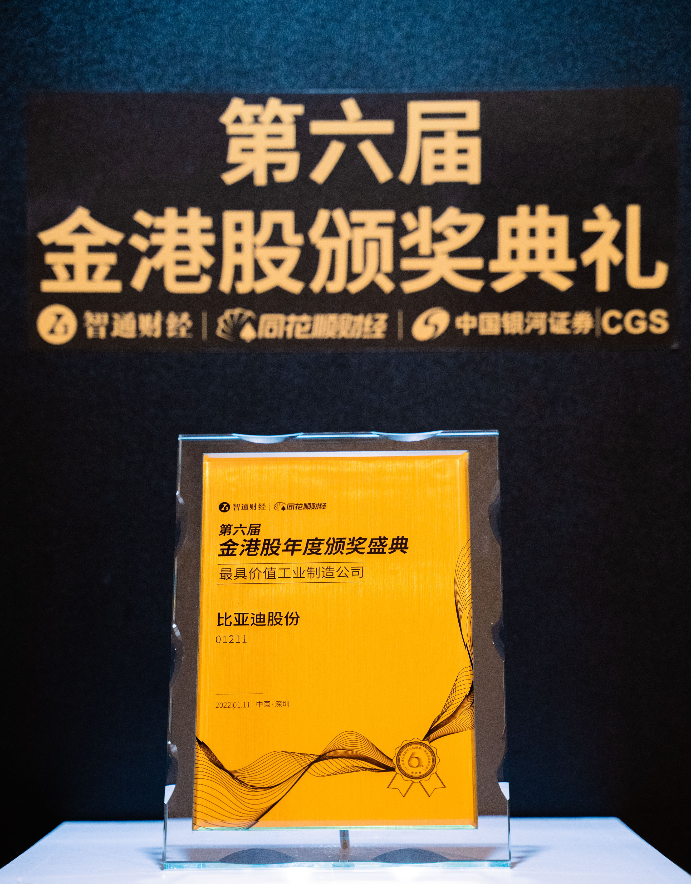 2022年1月11日,在深圳举办的“2022年全球投资趋势论坛暨第六届金港股颁奖典礼”上,比亚迪股份(01211)荣获“最具价值工业制造公司”奖项。
