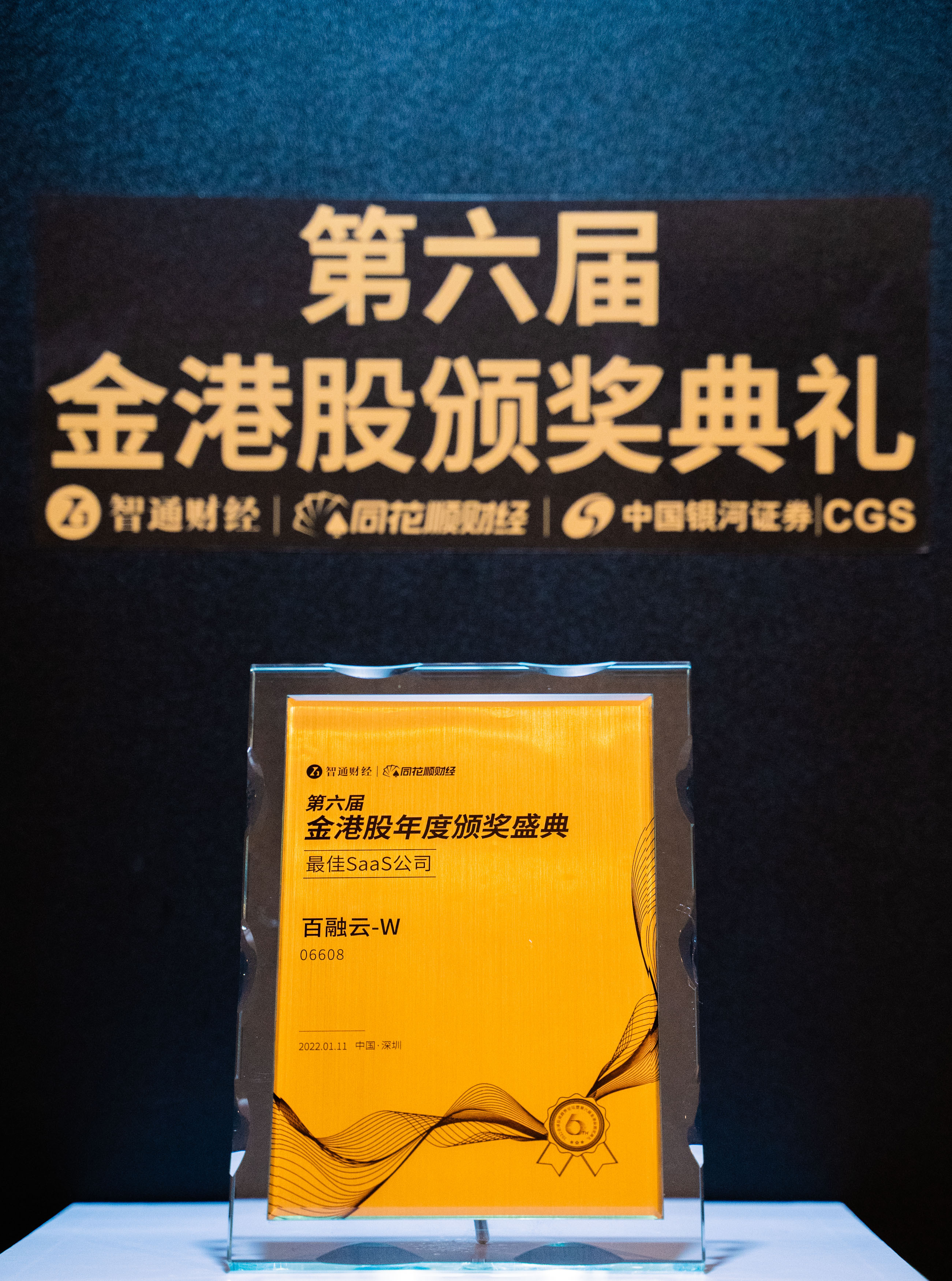 2022年1月11日,在深圳举办的“2022年全球投资趋势论坛暨第六届金港股颁奖典礼”上,百融云-W(06608)荣获“最佳SaaS公司”奖项。