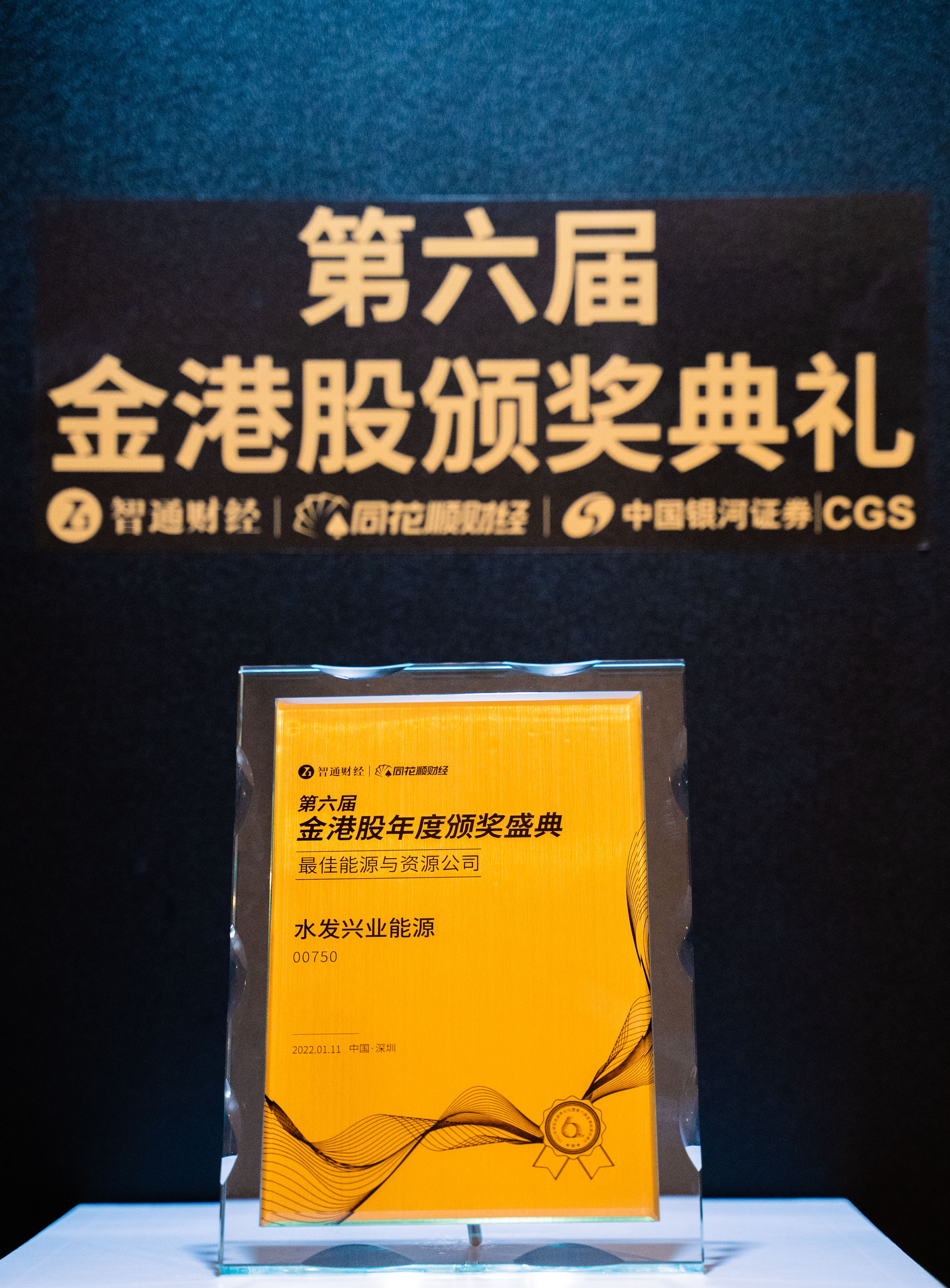 2022年1月11日,在深圳举办的“2022年全球投资趋势论坛暨第六届金港股颁奖典礼”上,水发兴业能源(00750)荣获“最佳能源与资源公司”奖项。