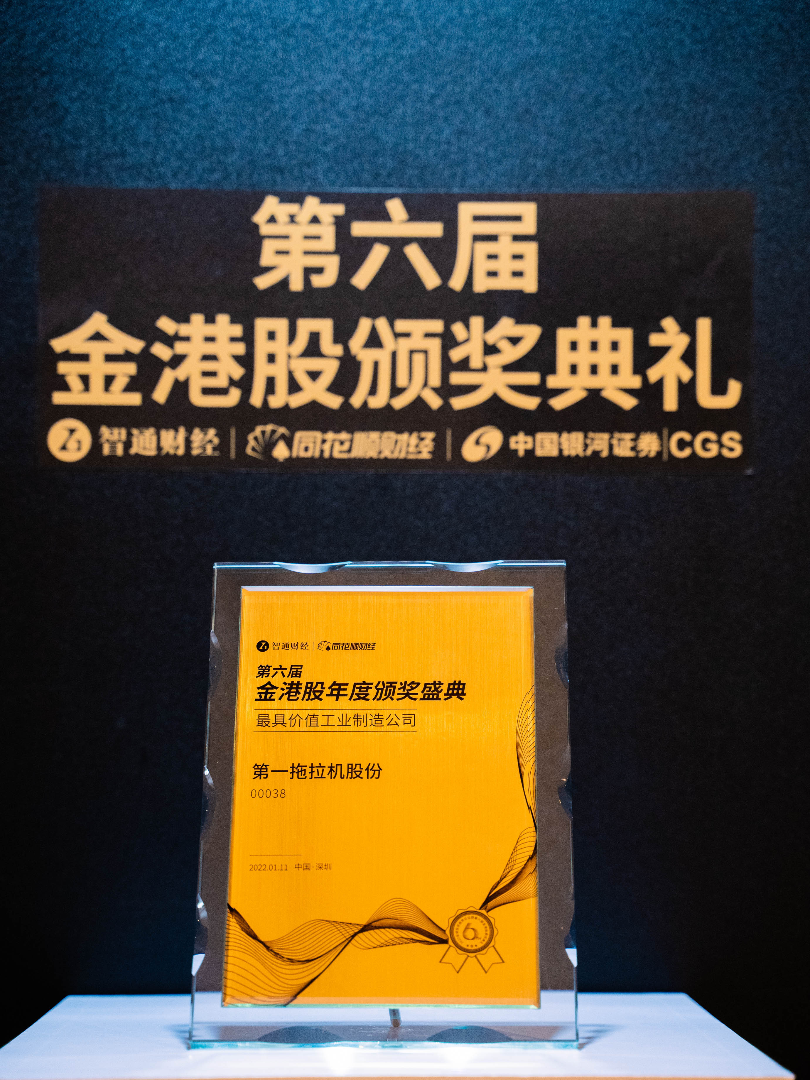 2022年1月11日,在深圳举办的“2022年全球投资趋势论坛暨第六届金港股颁奖典礼”上,第一拖拉机股份(00038)荣获“最具价值工业制造公司”奖项。