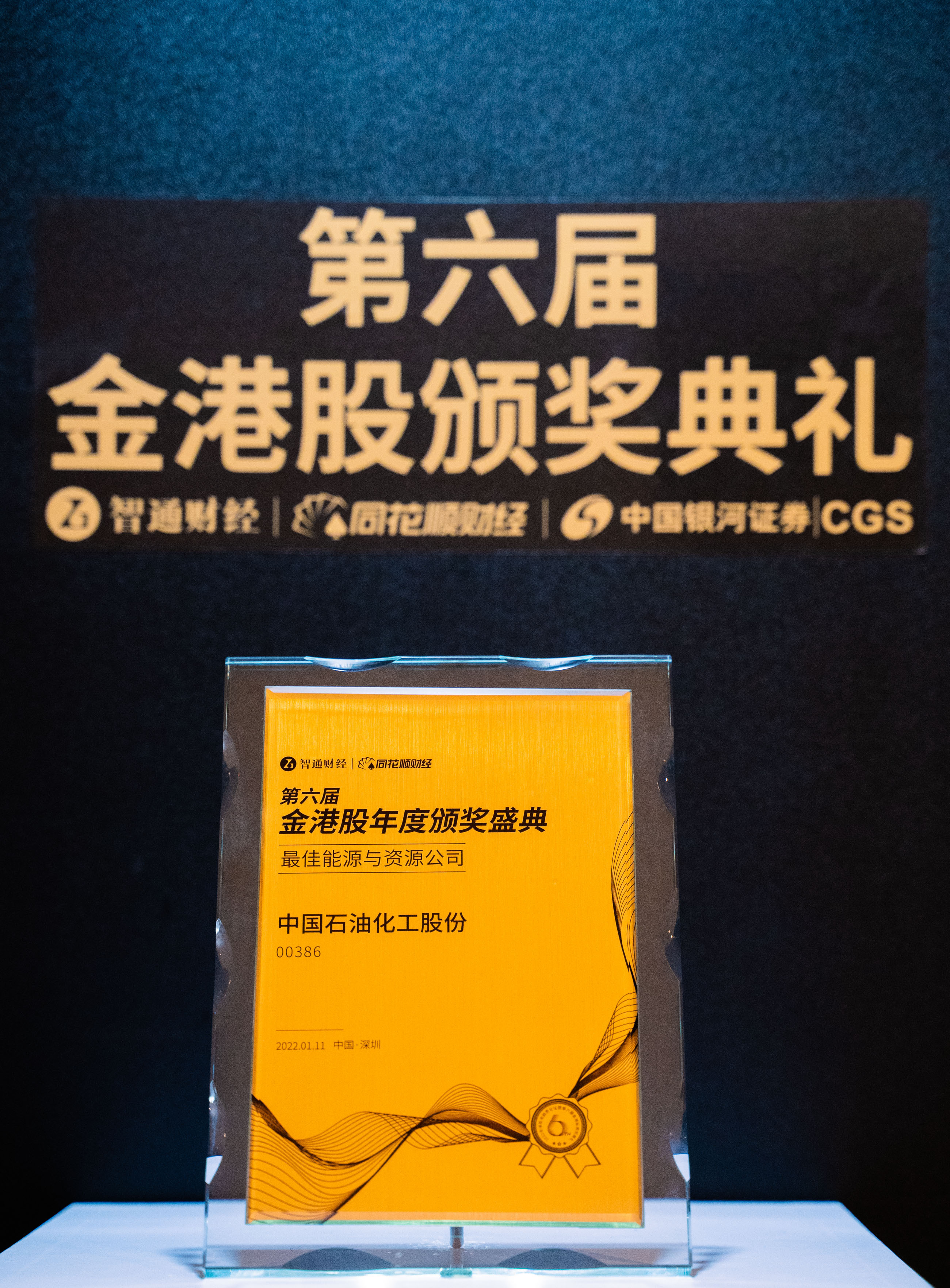 2022年1月11日,在深圳举办的“2022年全球投资趋势论坛暨第六届金港股颁奖典礼”上,中国石油化工股份(00386)荣获“最佳能源与资源公司”奖项。