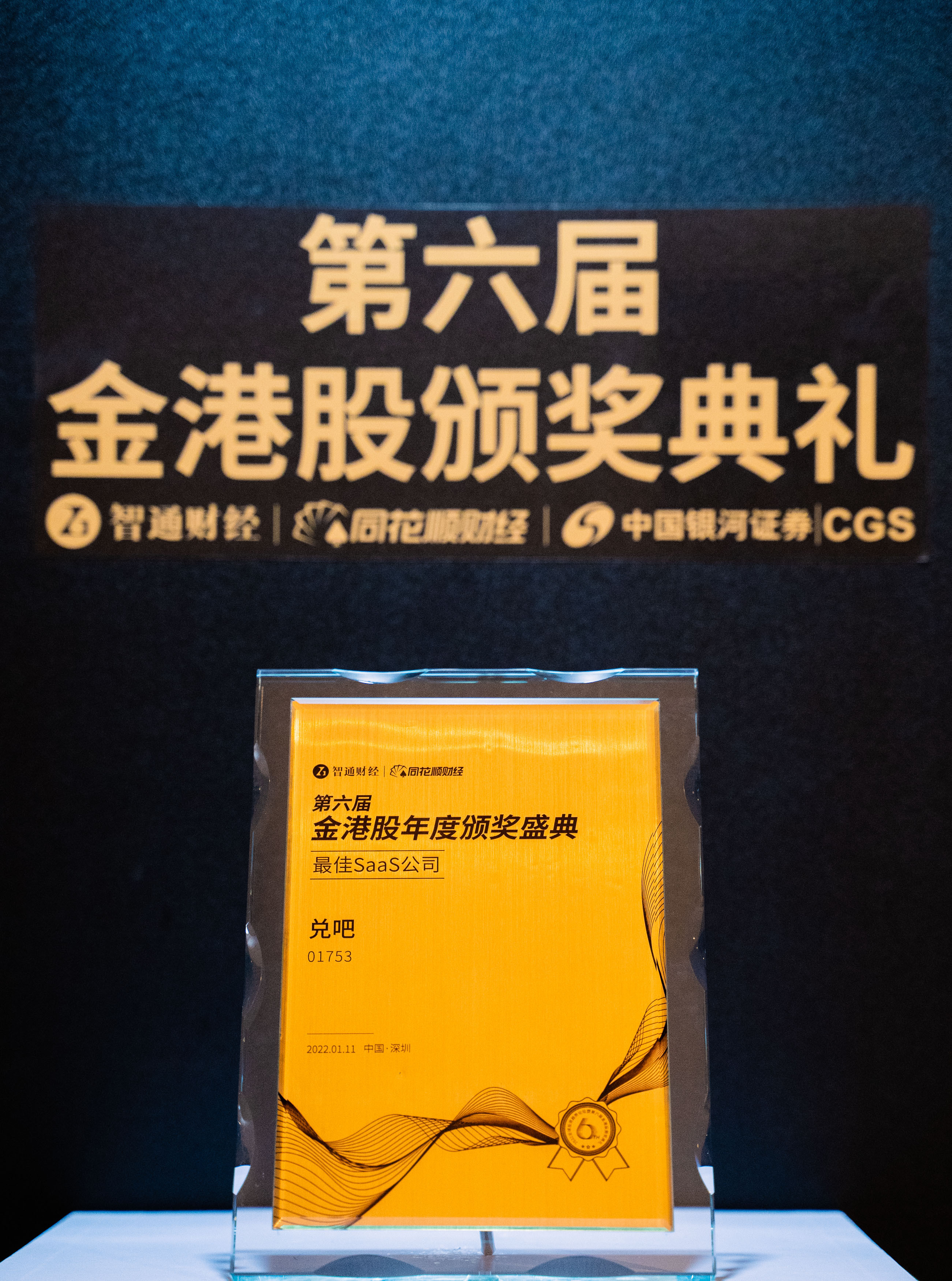 2022年1月11日,在深圳举办的“2022年全球投资趋势论坛暨第六届金港股颁奖典礼”上,兑吧(01753)荣获“最佳SaaS公司”奖项。