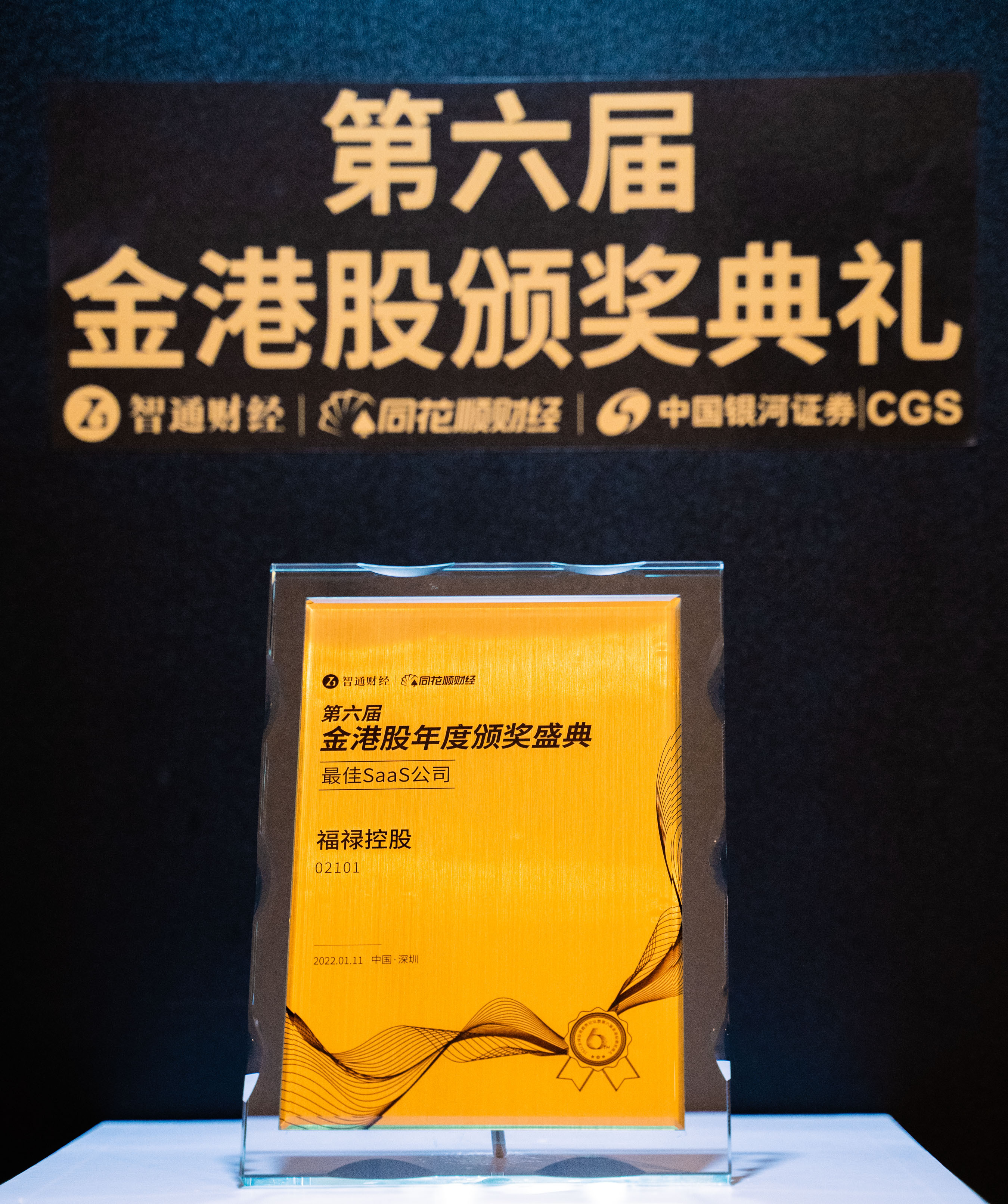 2022年1月11日,在深圳举办的“2022年全球投资趋势论坛暨第六届金港股颁奖典礼”上,福禄控股(02101)荣获“最佳SaaS公司”奖项。