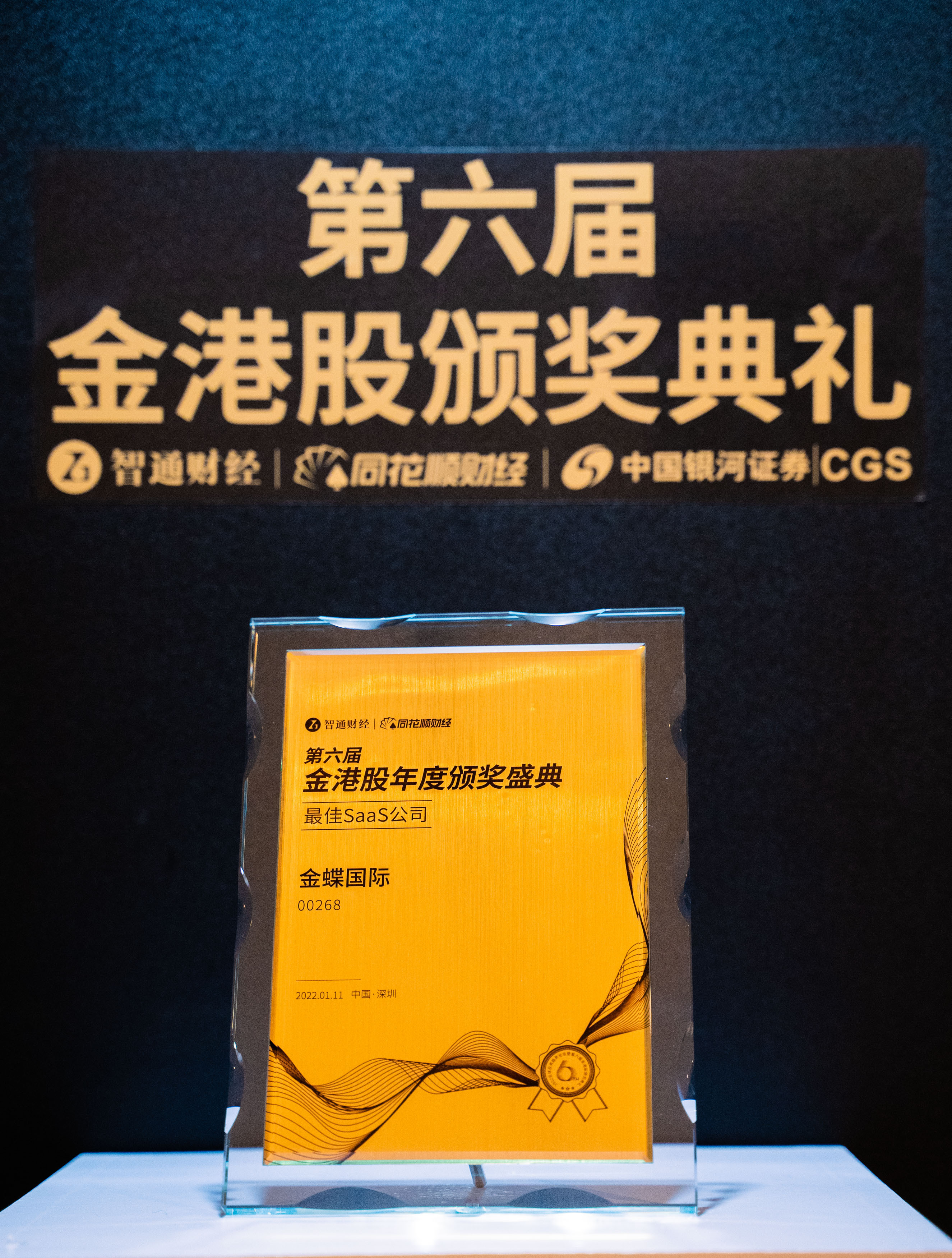 2022年1月11日,在深圳举办的“2022年全球投资趋势论坛暨第六届金港股颁奖典礼”上,金蝶国际(00268)荣获“最佳SaaS公司”奖项。
