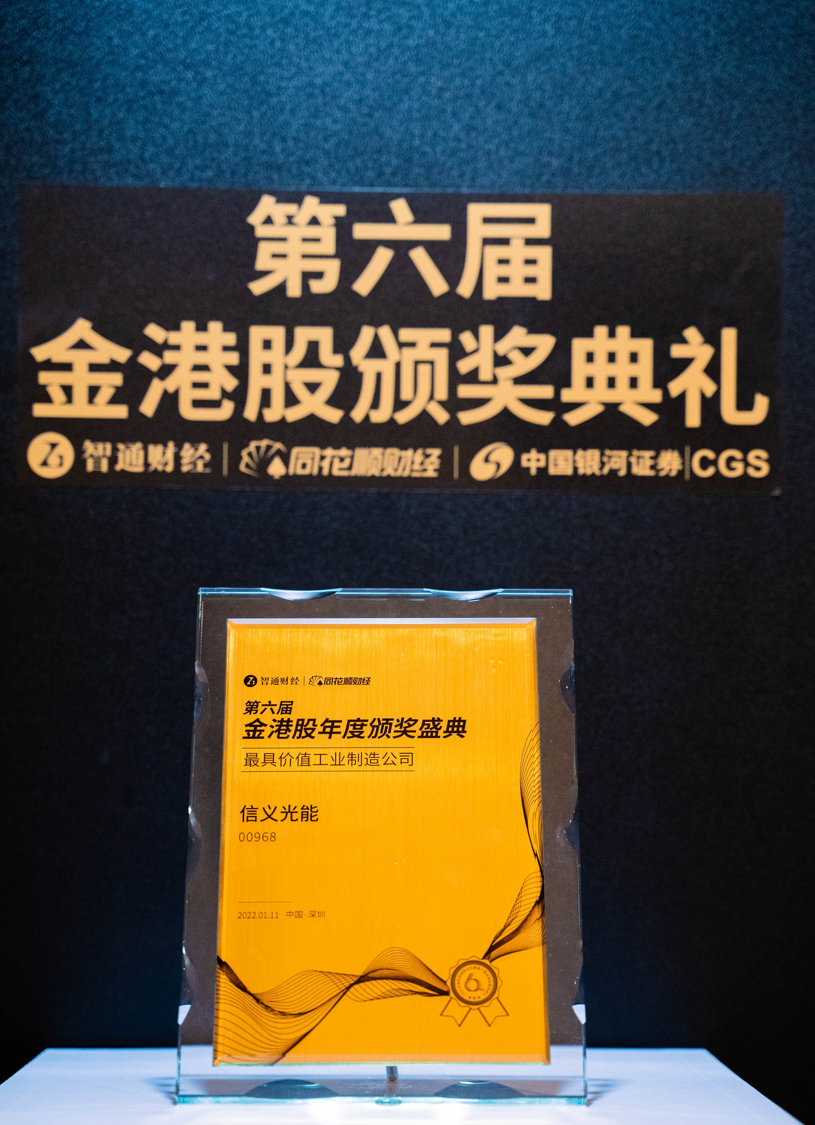 2022年1月11日,在深圳举办的“2022年全球投资趋势论坛暨第六届金港股颁奖典礼”上,信义光能(00968)荣获“最具价值工业制造公司”奖项。