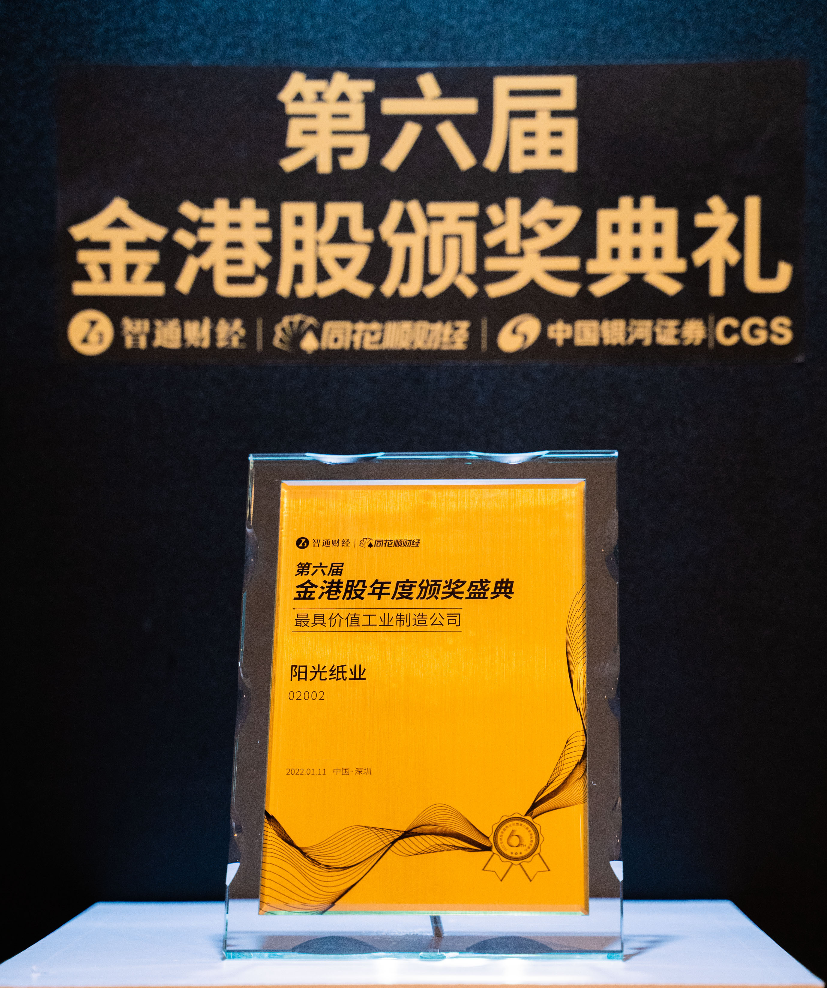 2022年1月11日,在深圳举办的“2022年全球投资趋势论坛暨第六届金港股颁奖典礼”上,阳光纸业(02002)荣获“最具价值工业制造公司”奖项。