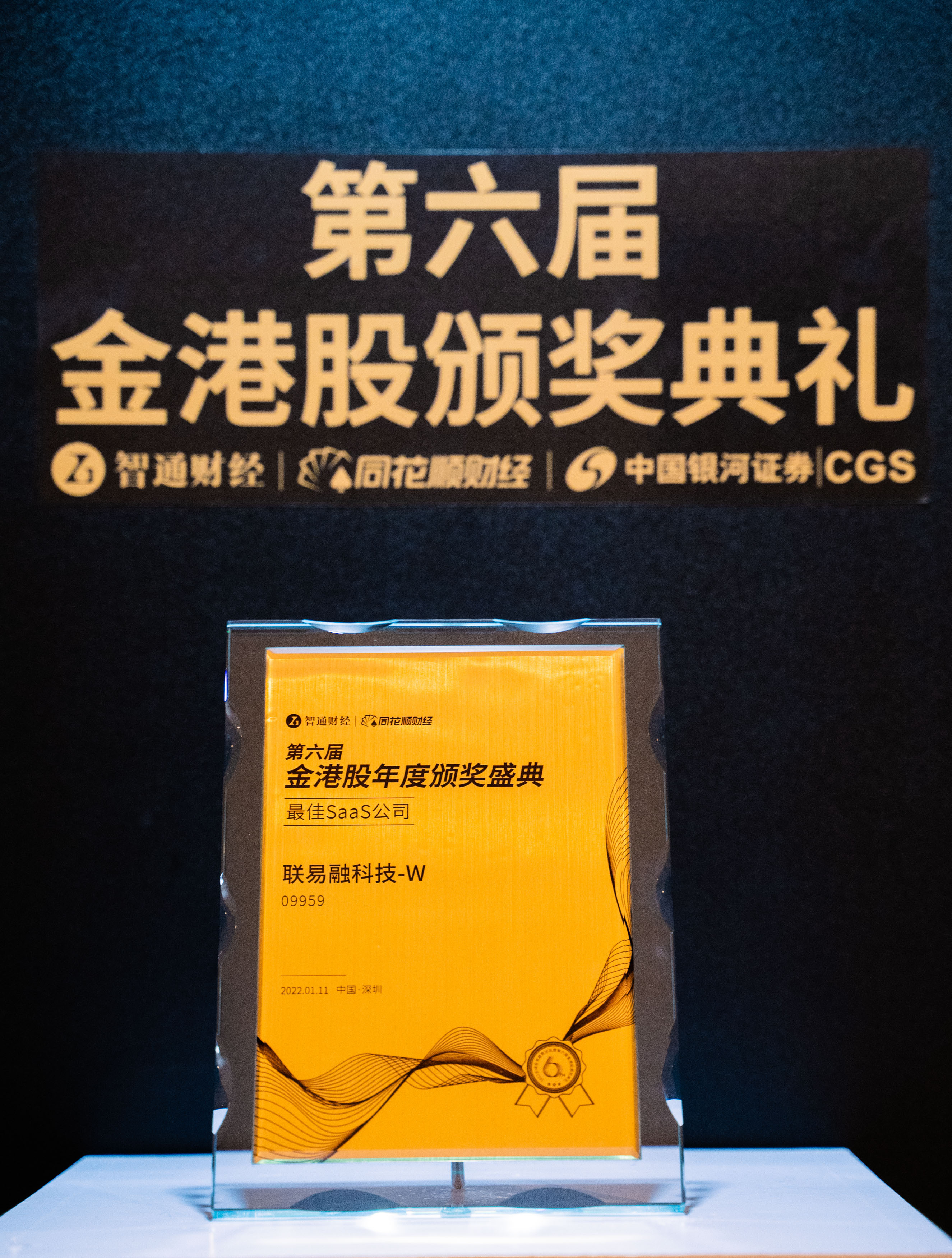 2022年1月11日,在深圳举办的“2022年全球投资趋势论坛暨第六届金港股颁奖典礼”上,联易融科技-W(09959)荣获“最佳SaaS公司”奖项。