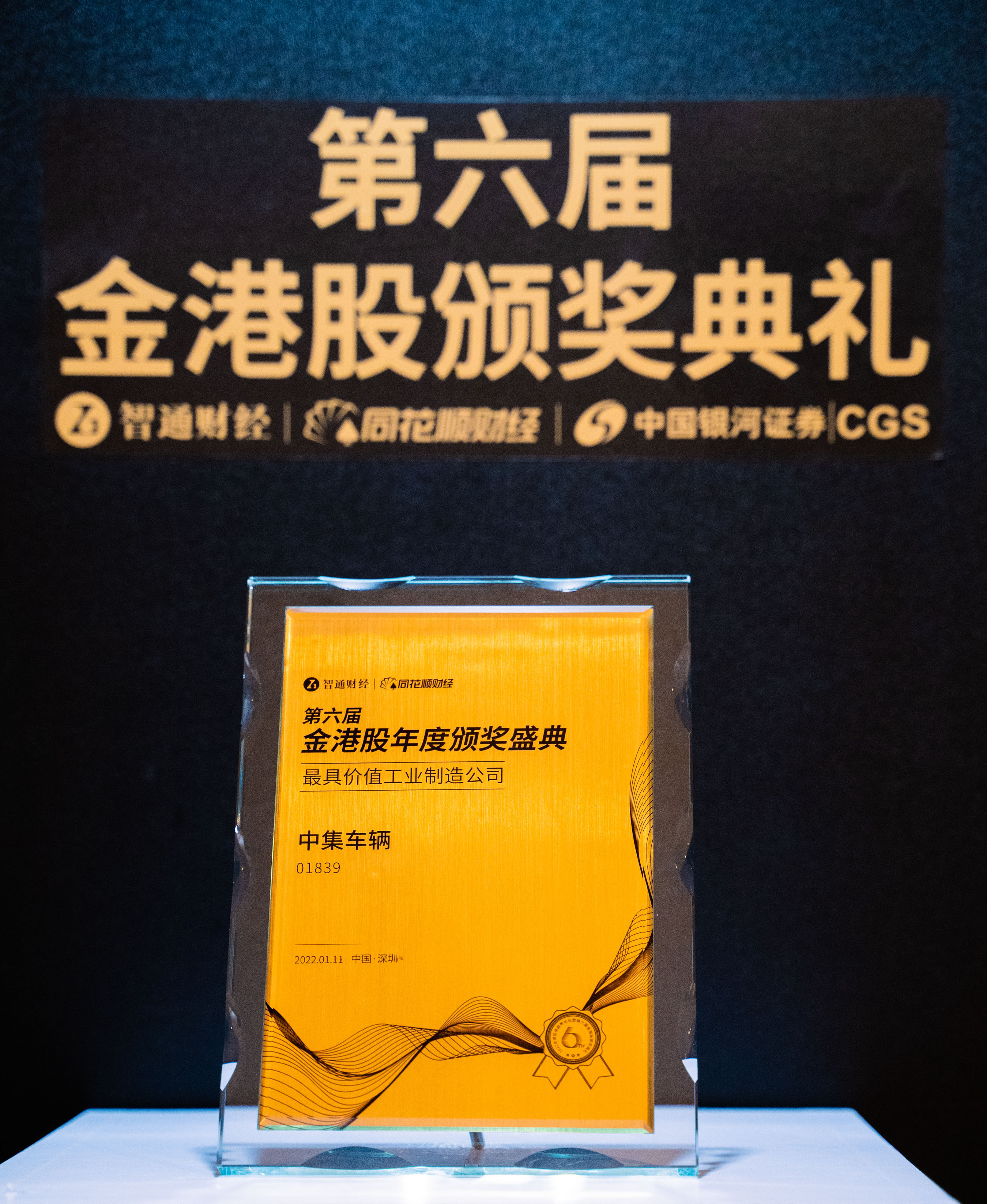 2022年1月11日,在深圳举办的“2022年全球投资趋势论坛暨第六届金港股颁奖典礼”上,中集车辆(01839)荣获“最具价值工业制造公司”奖项。