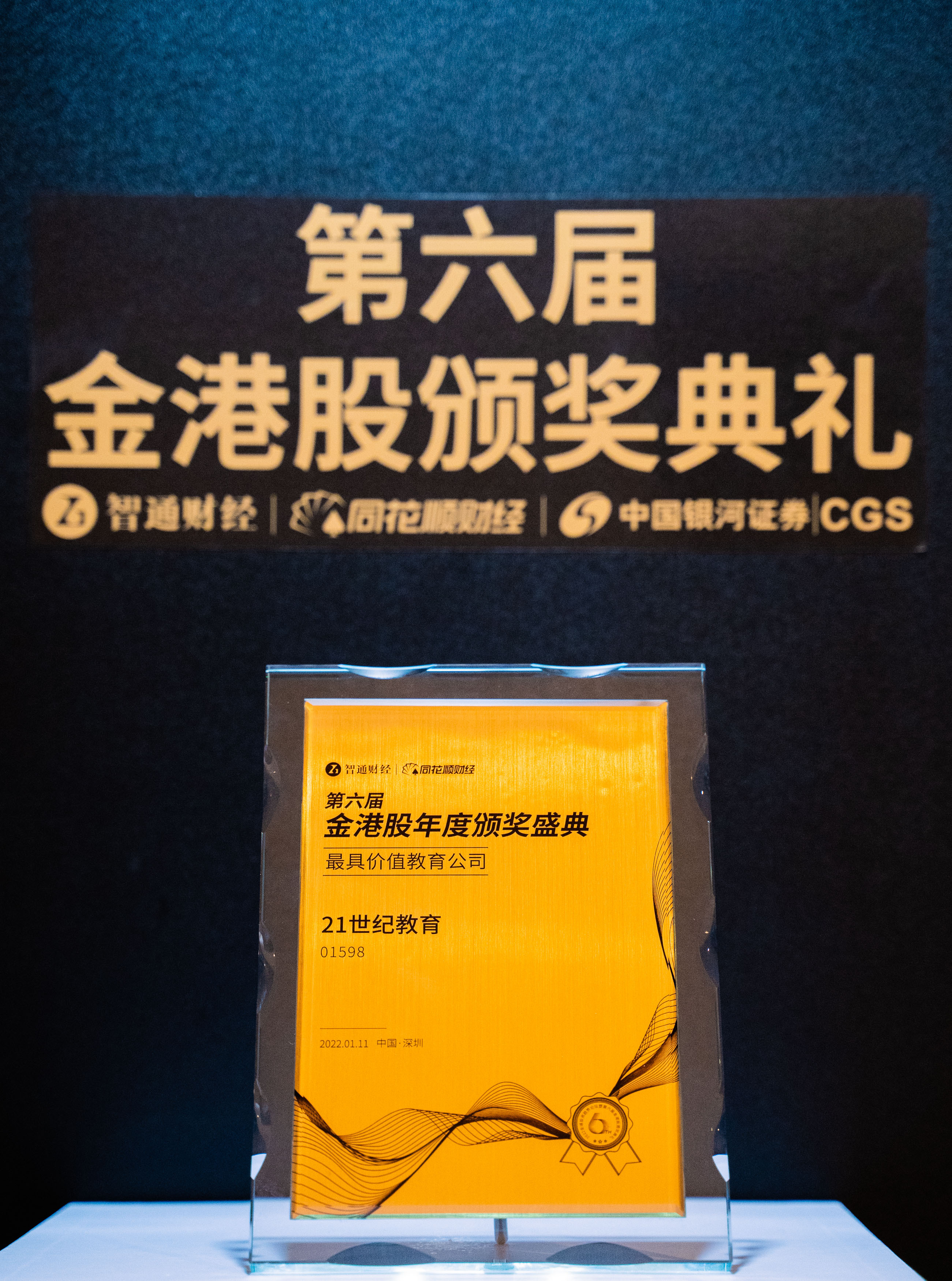 2022年1月11日,在深圳举办的“2022年全球投资趋势论坛暨第六届金港股颁奖典礼”上,21世纪教育(01598)荣获“最具价值教育公司”奖项。