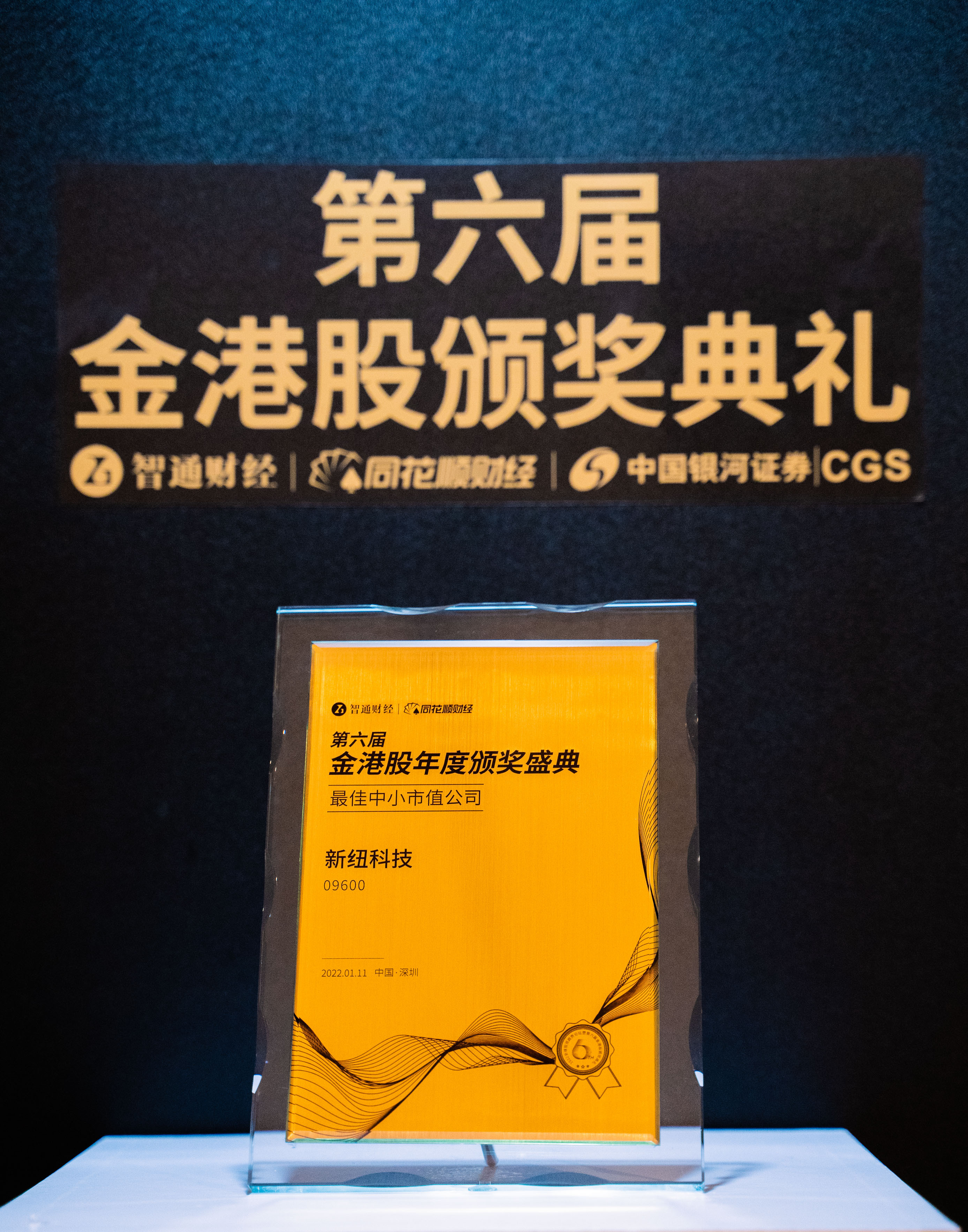 2022年1月11日,在深圳举办的“2022年全球投资趋势论坛暨第六届金港股颁奖典礼”上,新纽科技(09600)荣获“最佳中小市值公司”奖项。
