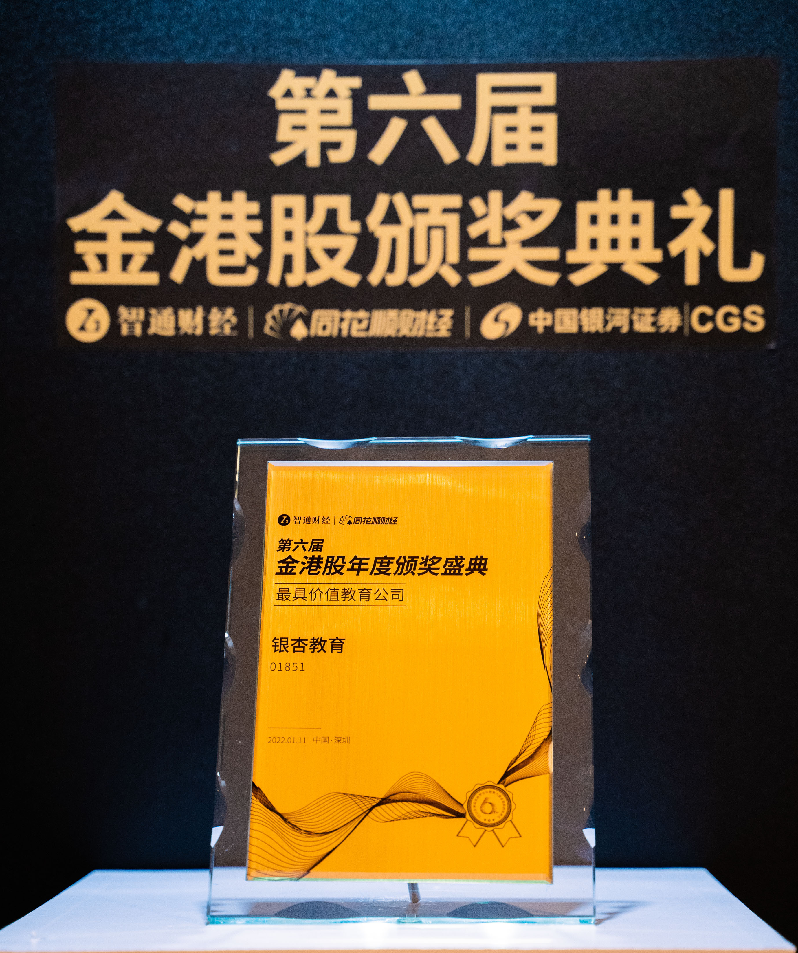 2022年1月11日,在深圳举办的“2022年全球投资趋势论坛暨第六届金港股颁奖典礼”上,银杏教育(01851)荣获“最具价值教育公司”奖项。