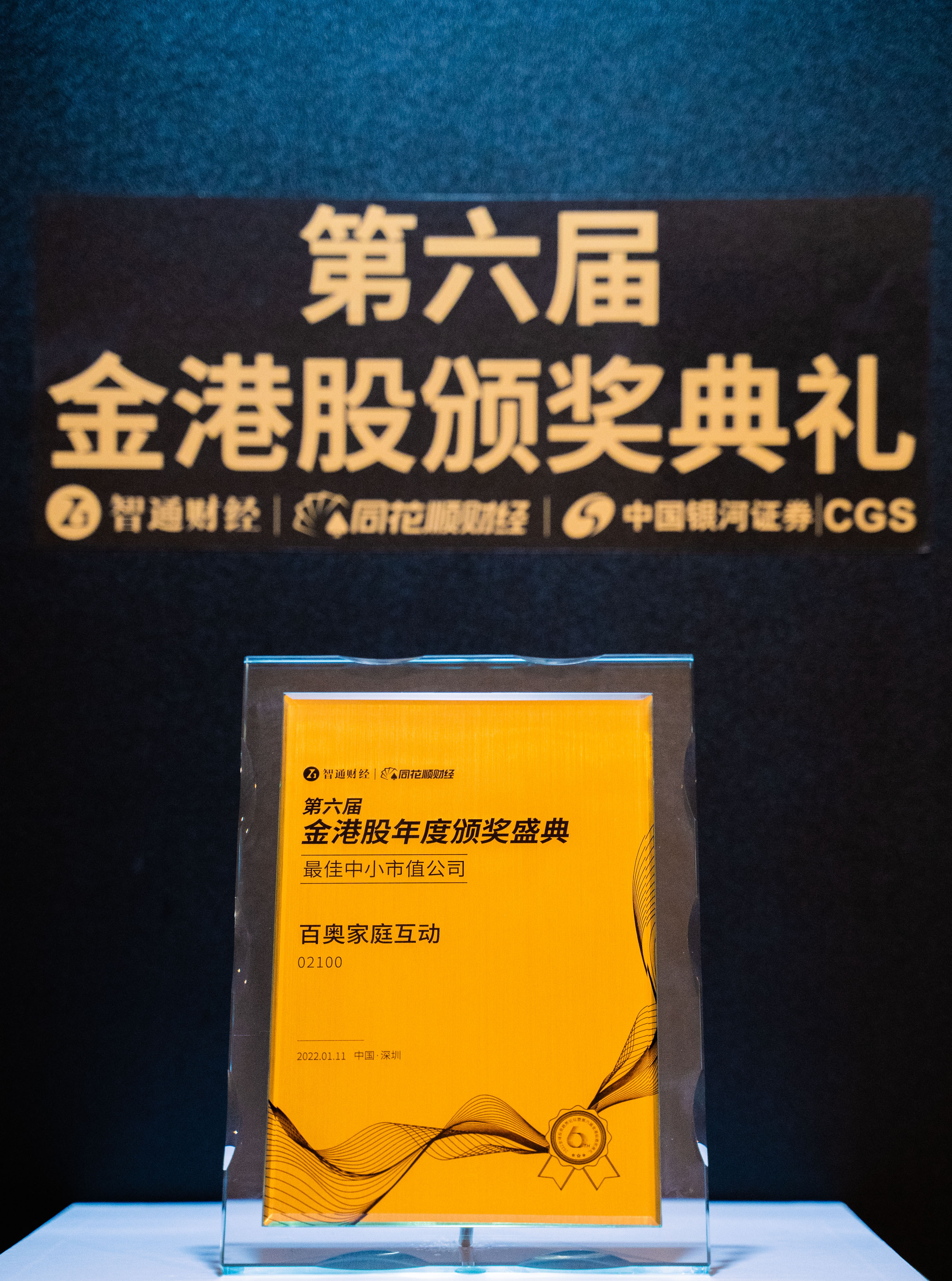 2022年1月11日,在深圳举办的“2022年全球投资趋势论坛暨第六届金港股颁奖典礼”上,百奥家庭互动(02100)荣获“最佳中小市值公司”奖项。