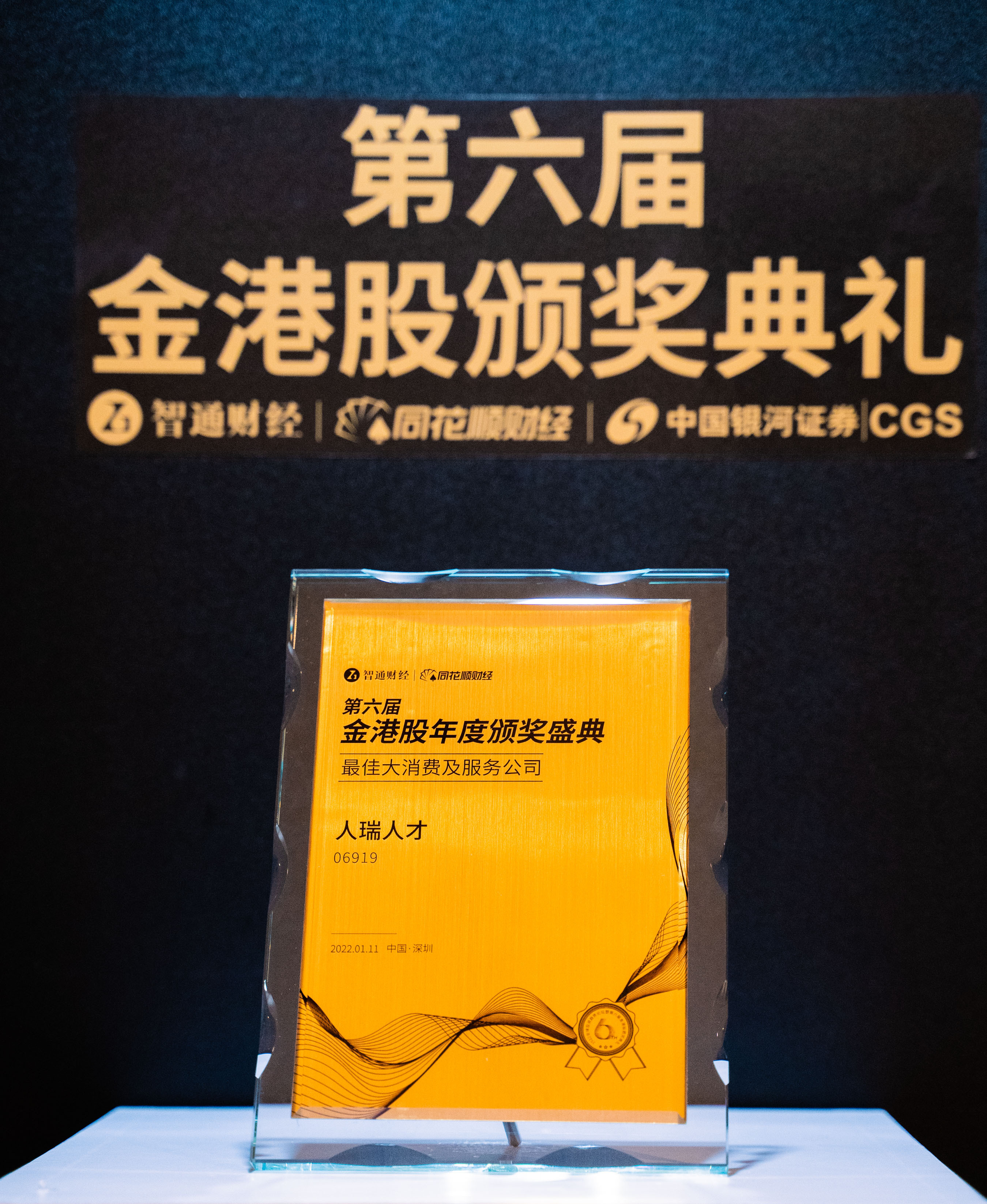 2022年1月11日,在深圳举办的“2022年全球投资趋势论坛暨第六届金港股颁奖典礼”上,人瑞人才(06919)荣获“最具价值大消费及服务公司”奖项。