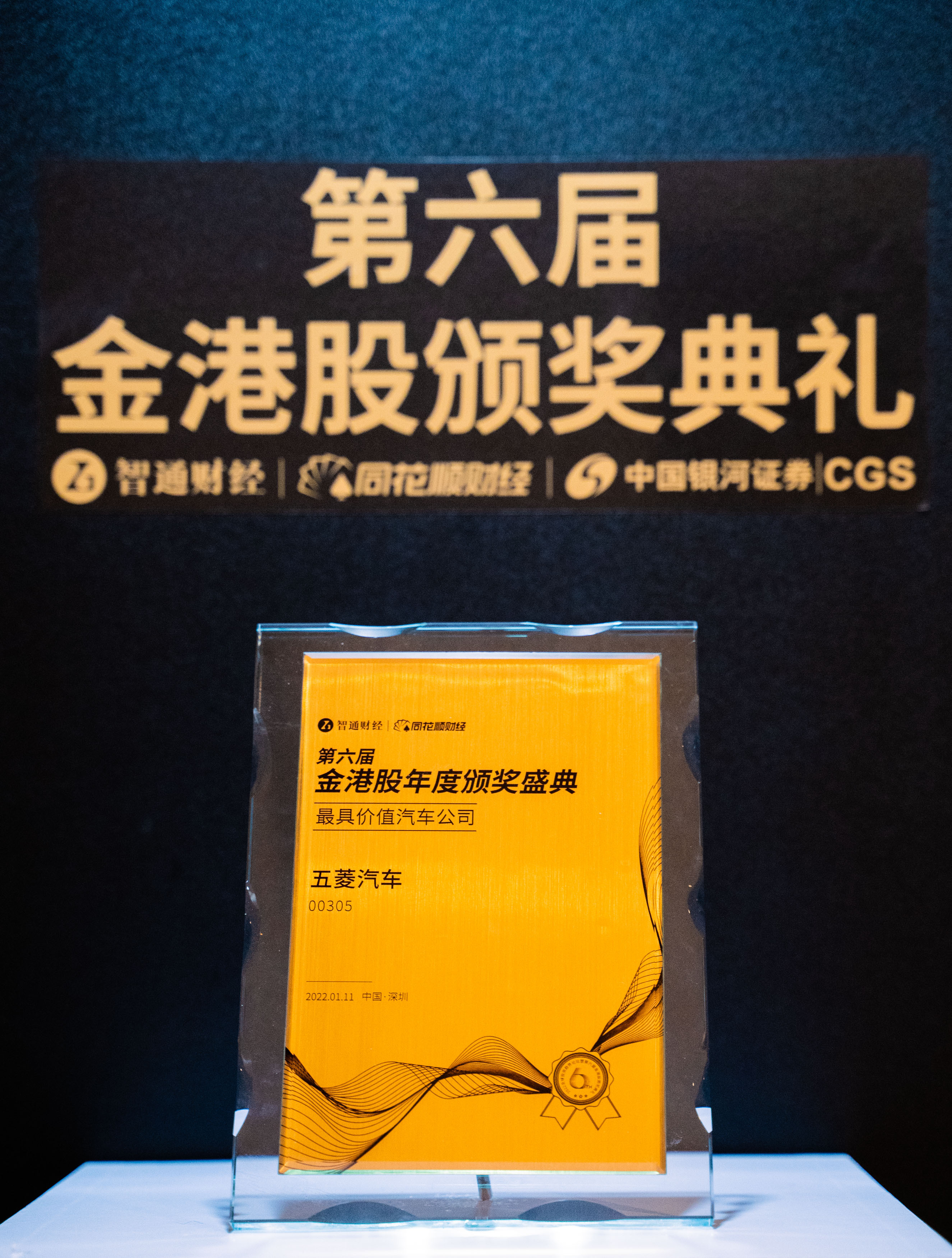 2022年1月11日,在深圳举办的“2022年全球投资趋势论坛暨第六届金港股颁奖典礼”上,五菱汽车(00305)荣获“最具价值汽车公司”奖项。