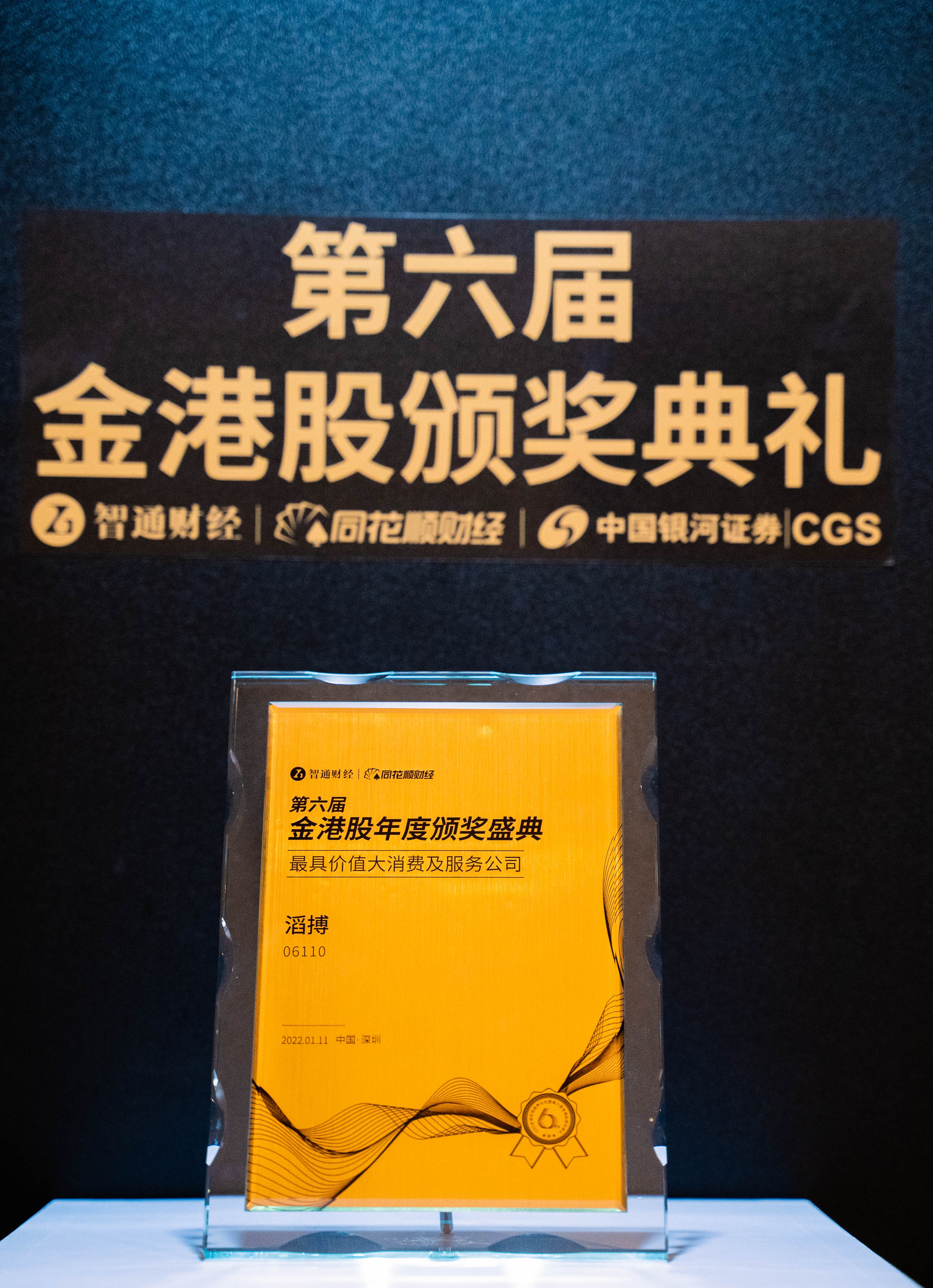 2022年1月11日,在深圳举办的“2022年全球投资趋势论坛暨第六届金港股颁奖典礼”上,滔搏(06110)荣获“最具价值大消费及服务公司”奖项。