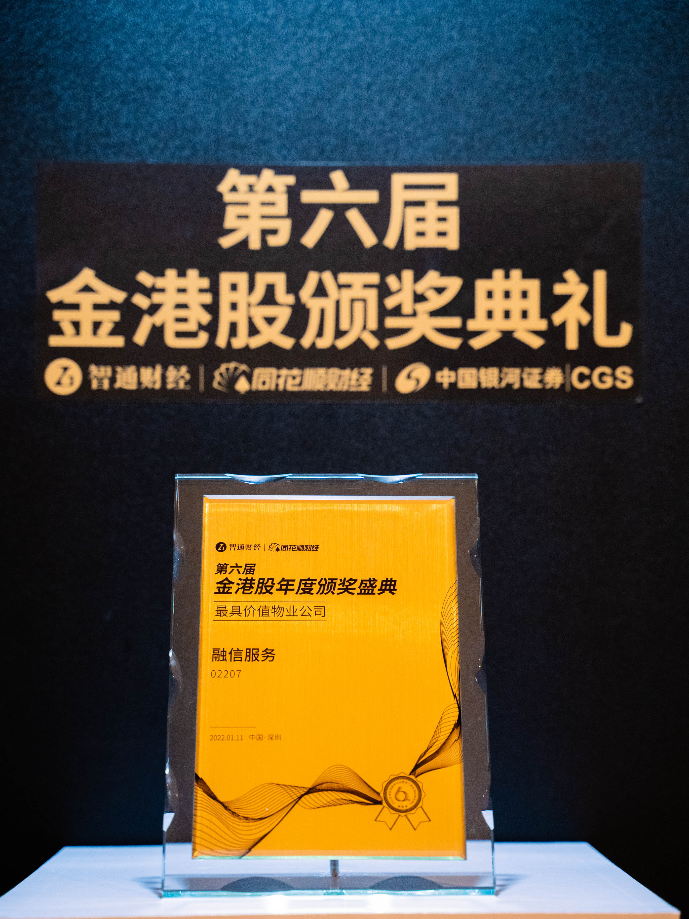 2022年1月11日,在深圳举办的“2022年全球投资趋势论坛暨第六届金港股颁奖典礼”上,融信服务(02207)荣获“最具价值物业公司”奖项。