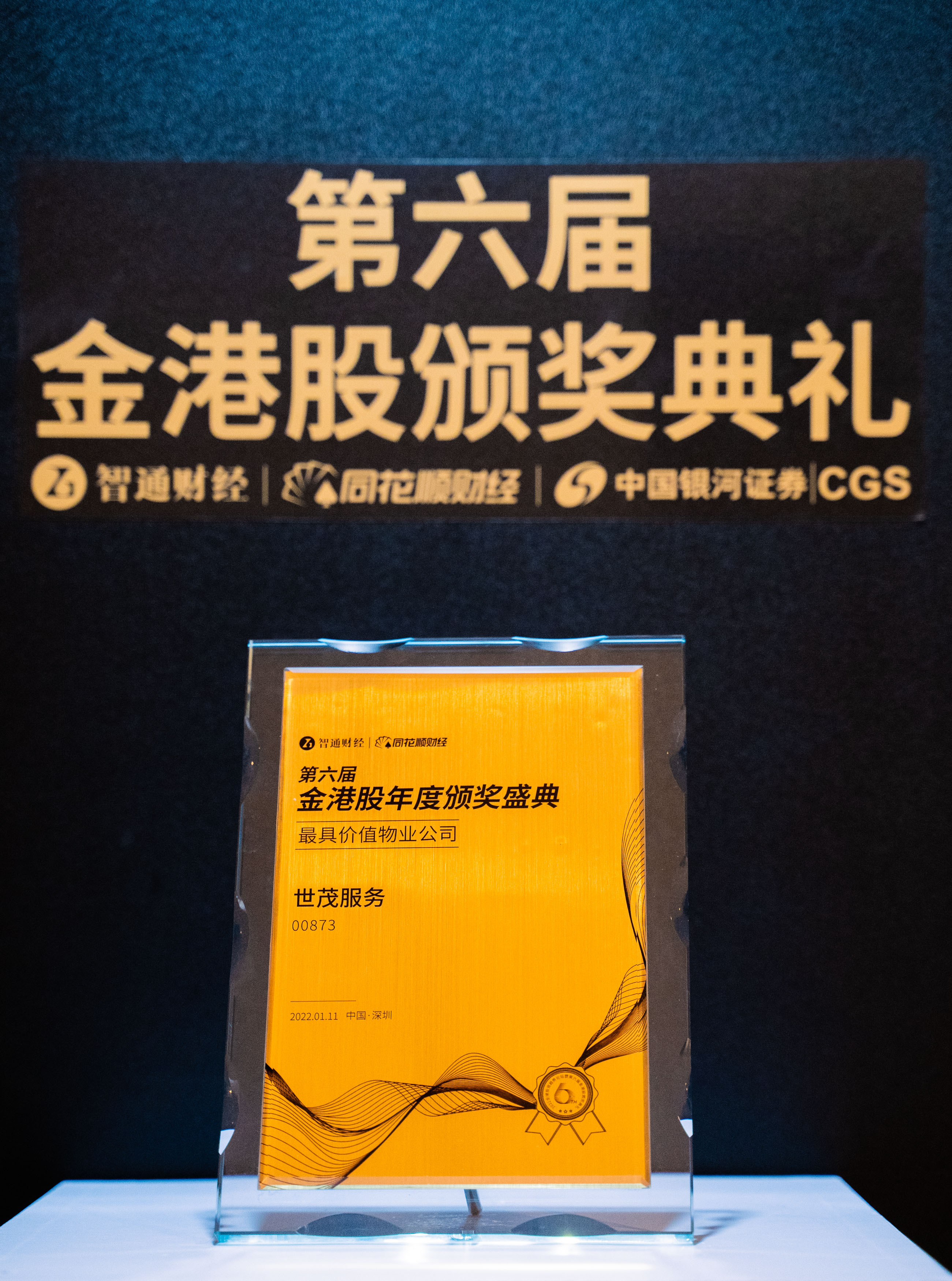 2022年1月11日,在深圳举办的“2022年全球投资趋势论坛暨第六届金港股颁奖典礼”上,世茂服务(00873)荣获“最具价值物业公司”奖项。