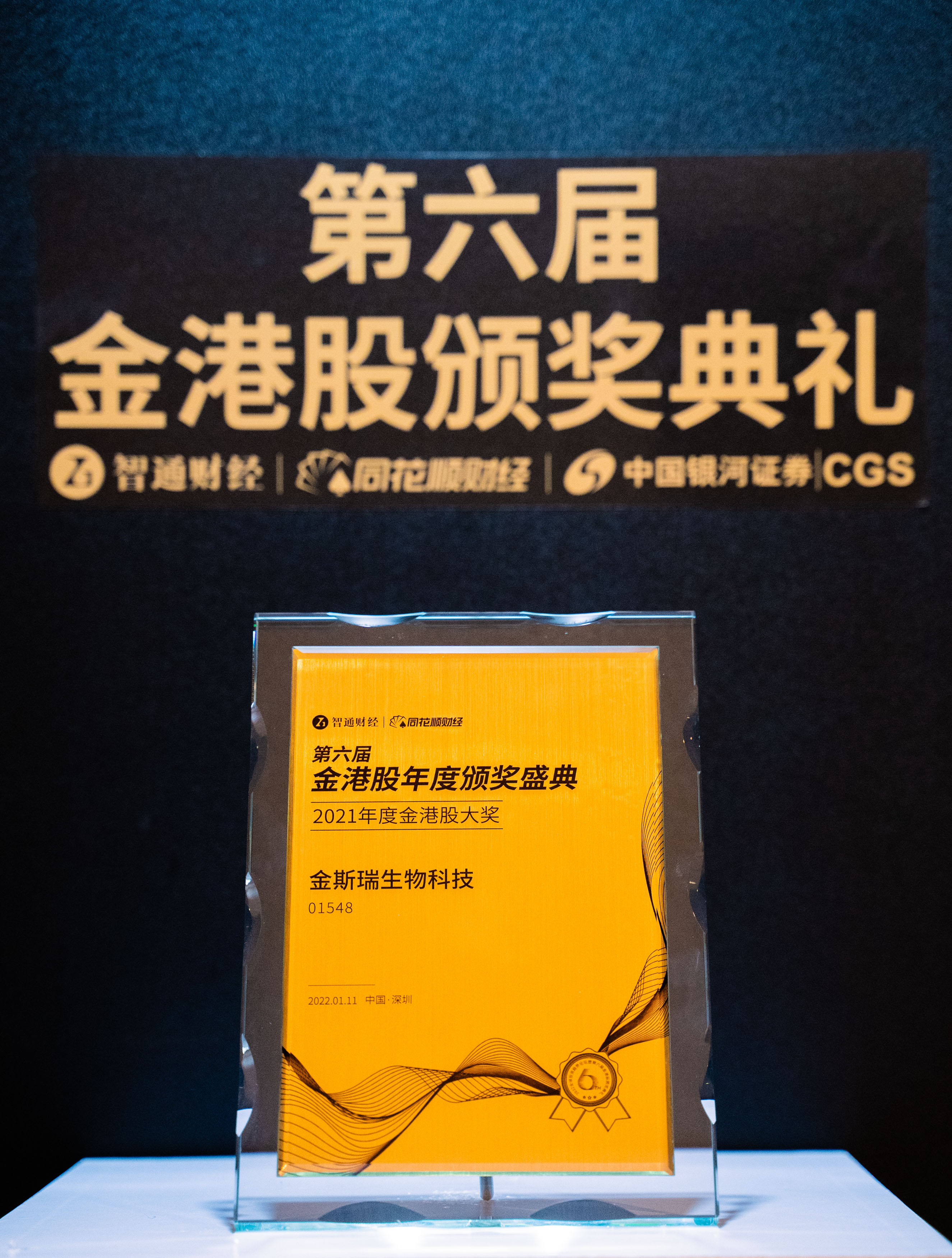 2022年1月11日,在深圳举办的“2022年全球投资趋势论坛暨第六届金港股颁奖典礼”上,金斯瑞生物科技(01548)荣获“2021年度金港股公司”大奖。
