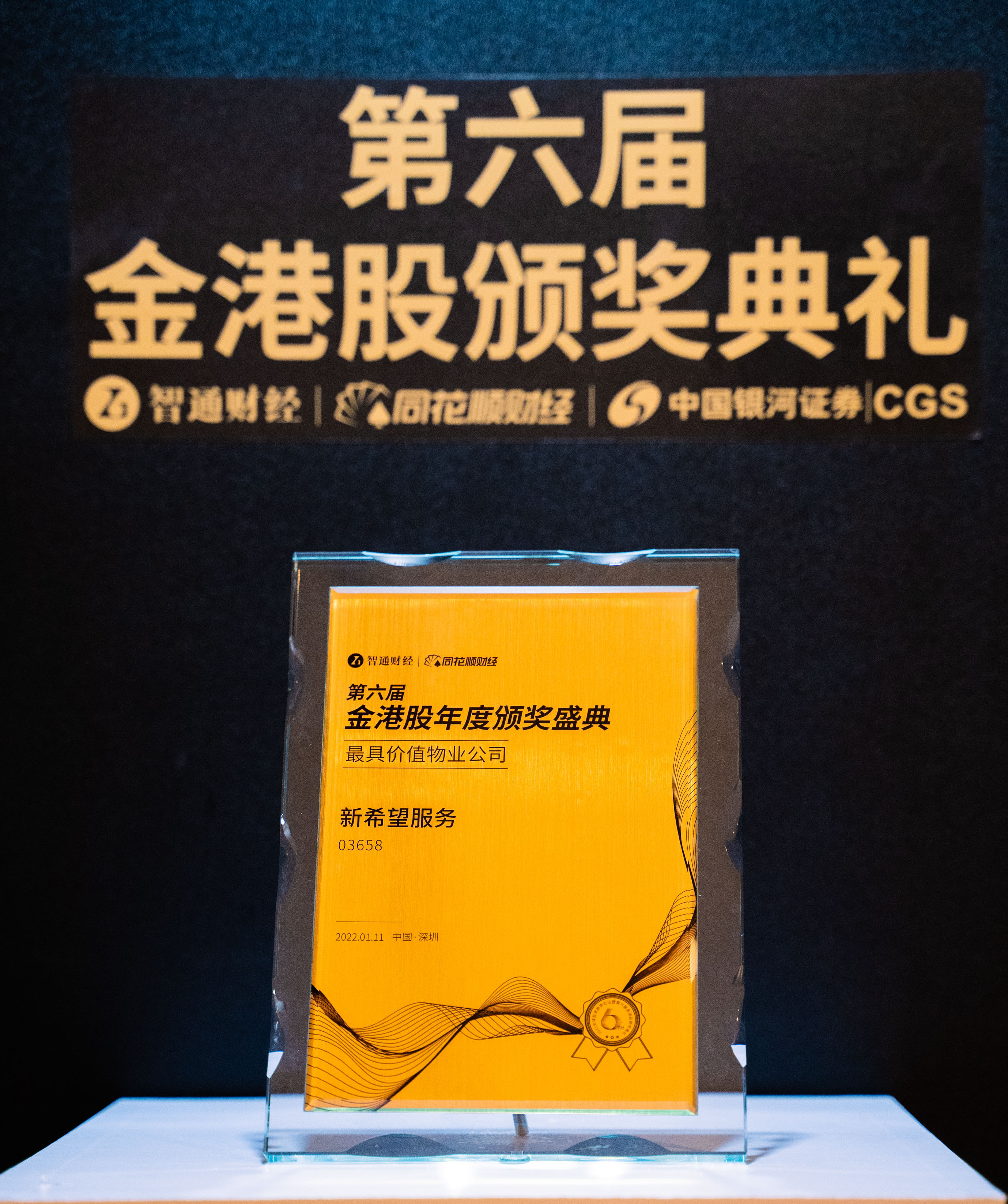 2022年1月11日,在深圳举办的“2022年全球投资趋势论坛暨第六届金港股颁奖典礼”上,新希望服务(03658)荣获“最具价值物业公司”奖项。
