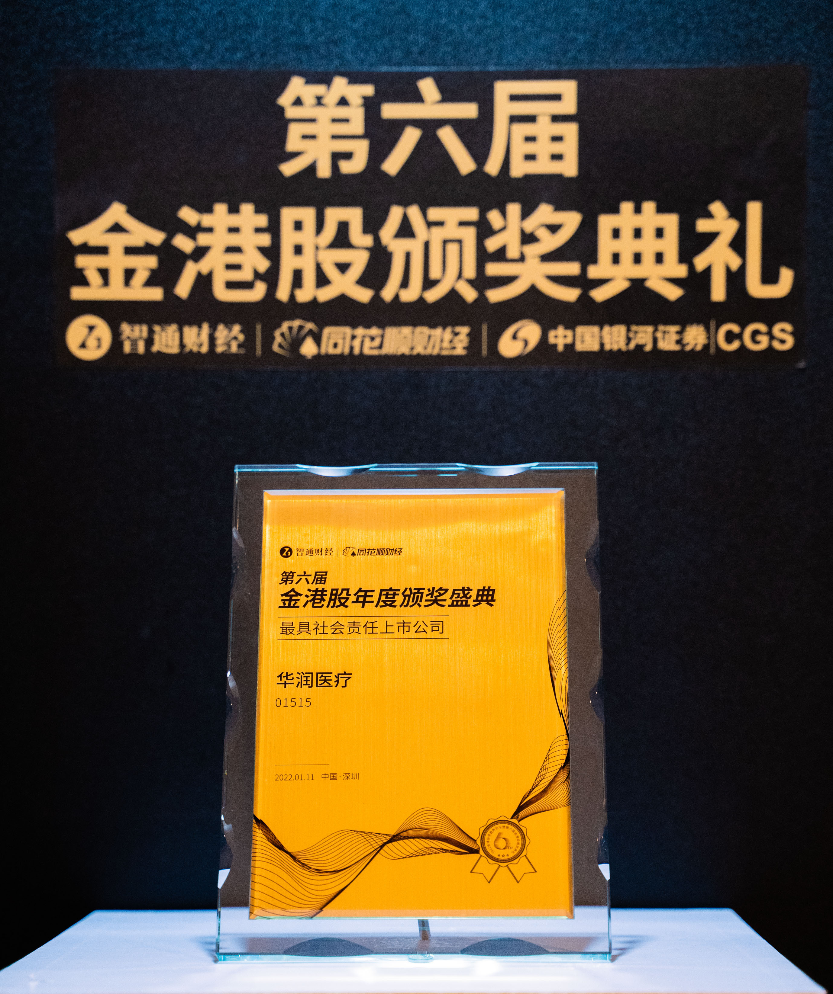 2022年1月11日,在深圳举办的“2022年全球投资趋势论坛暨第六届金港股颁奖典礼”上,华润医疗(01515)荣获“最具社会责任上市公司”大奖。