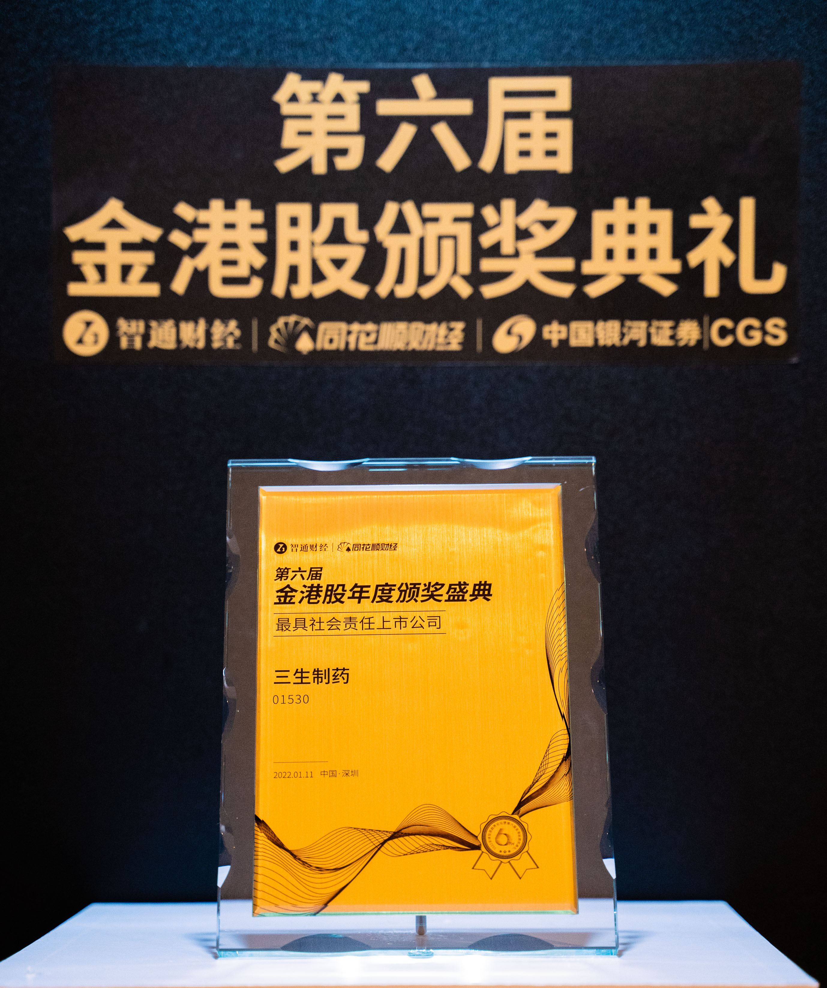 2022年1月11日,在深圳举办的“2022年全球投资趋势论坛暨第六届金港股颁奖典礼”上,三生制药(01530)荣获“最具社会责任上市公司”大奖。