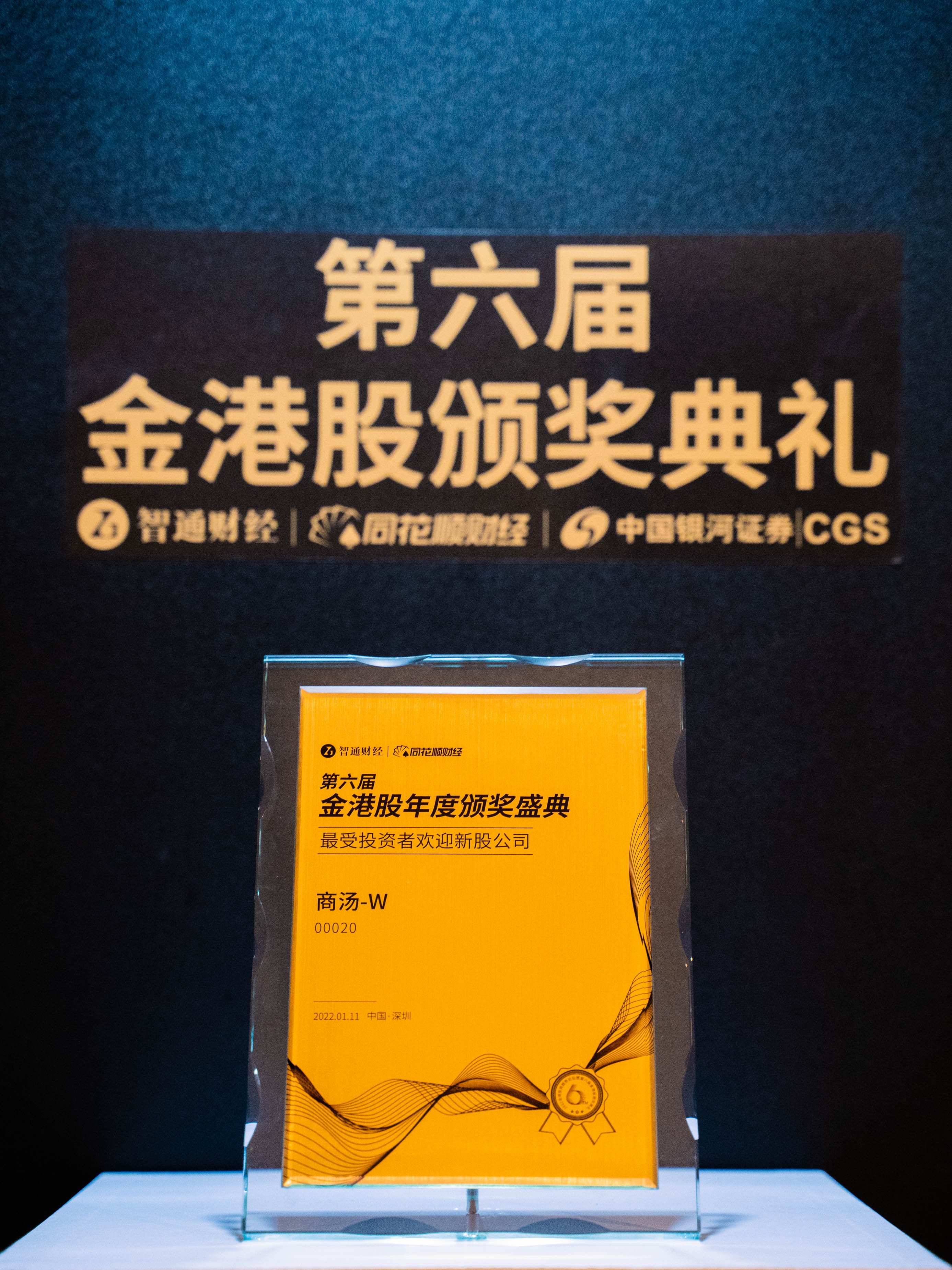 2022年1月11日,在深圳举办的“2022年全球投资趋势论坛暨第六届金港股颁奖典礼”上,商汤-W(00020)荣获“最受投资者欢迎新股公司”奖项。