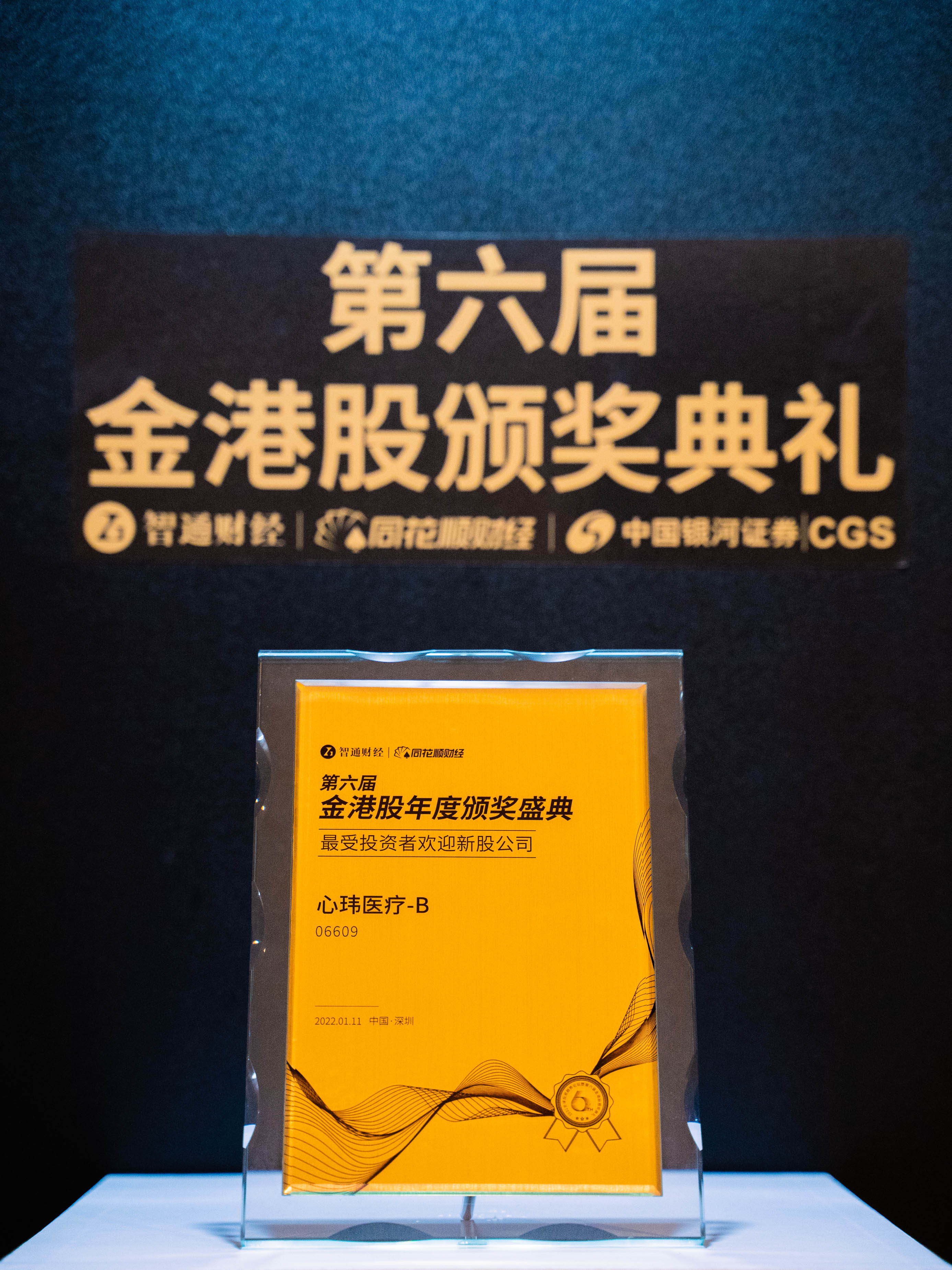 2022年1月11日,在深圳举办的“2022年全球投资趋势论坛暨第六届金港股颁奖典礼”上,心玮医疗-B(06609)荣获“最受投资者欢迎新股公司”奖项。