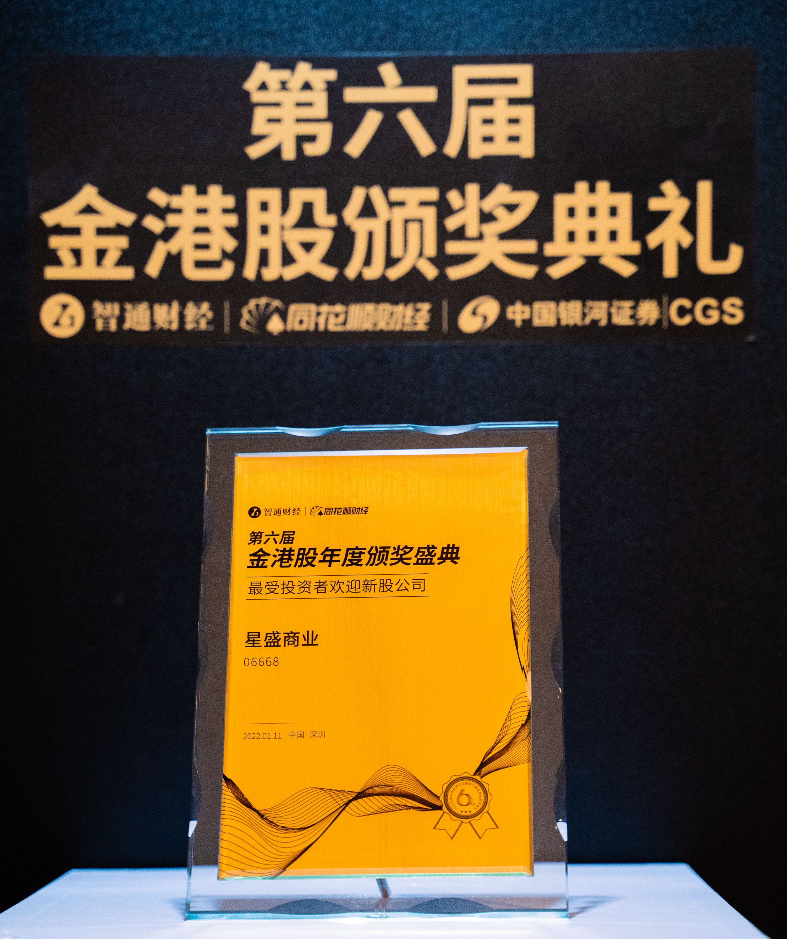 2022年1月11日,在深圳举办的“2022年全球投资趋势论坛暨第六届金港股颁奖典礼”上,星盛商业(06668)荣获“最受投资者欢迎新股公司”奖项。